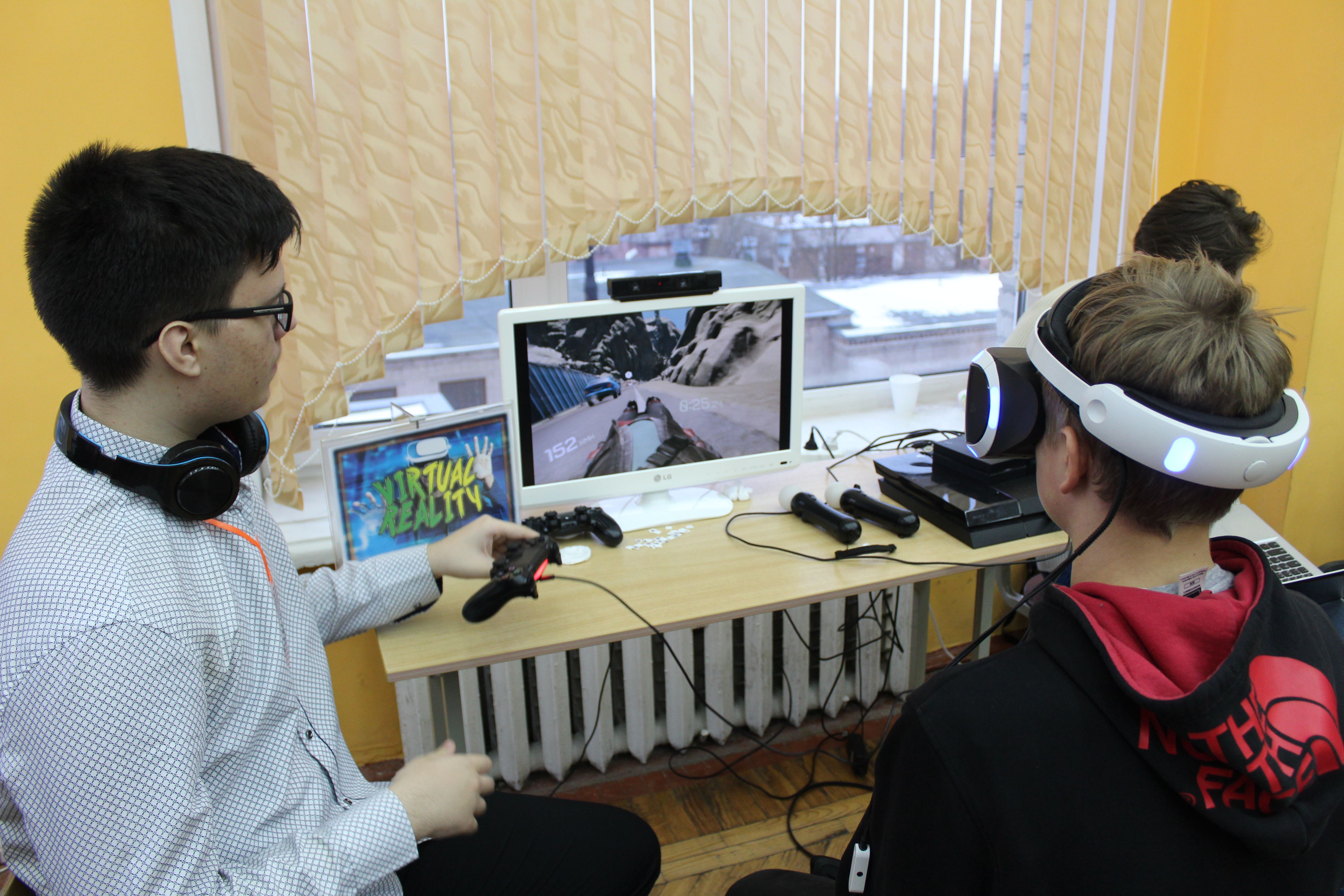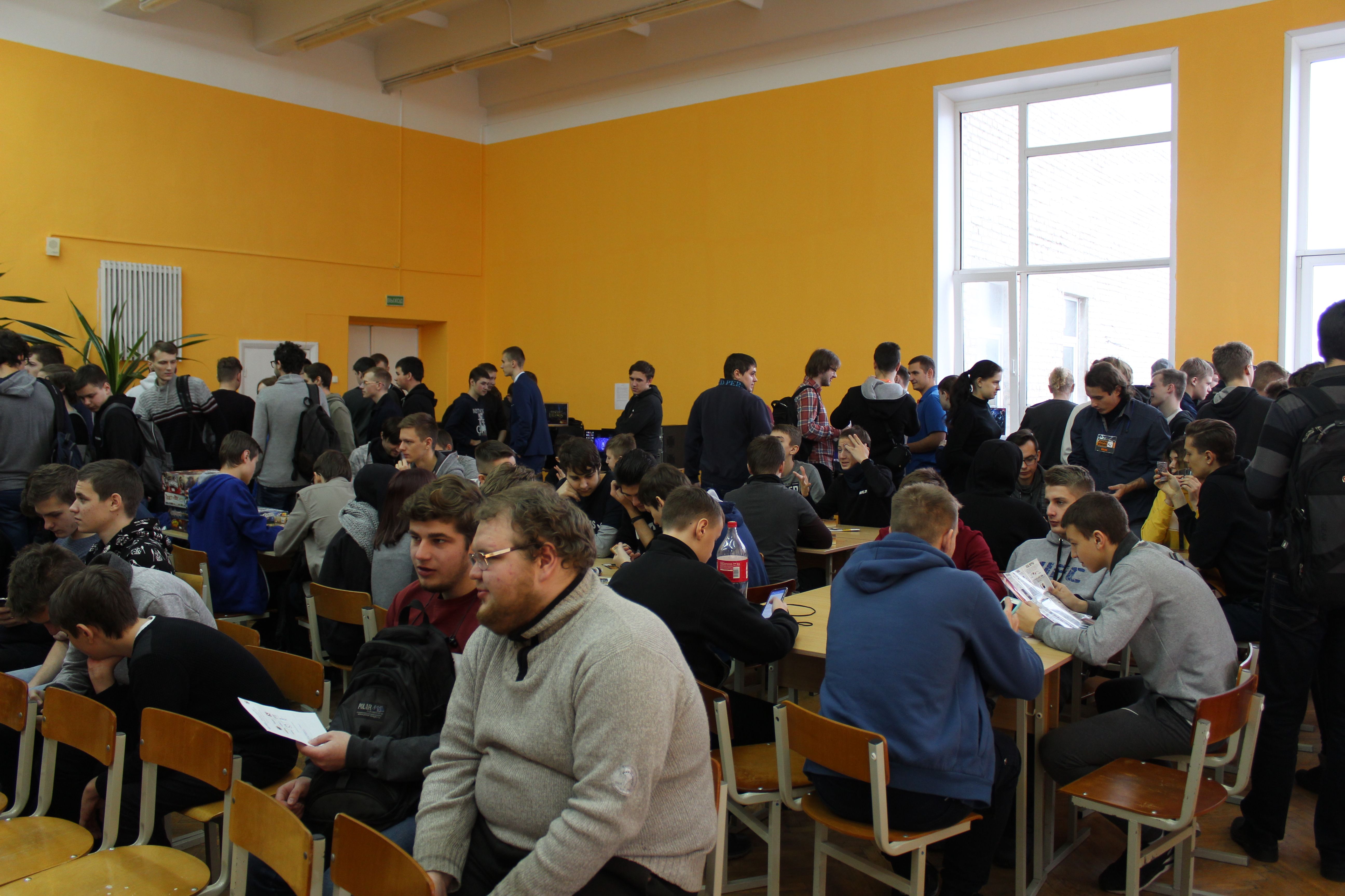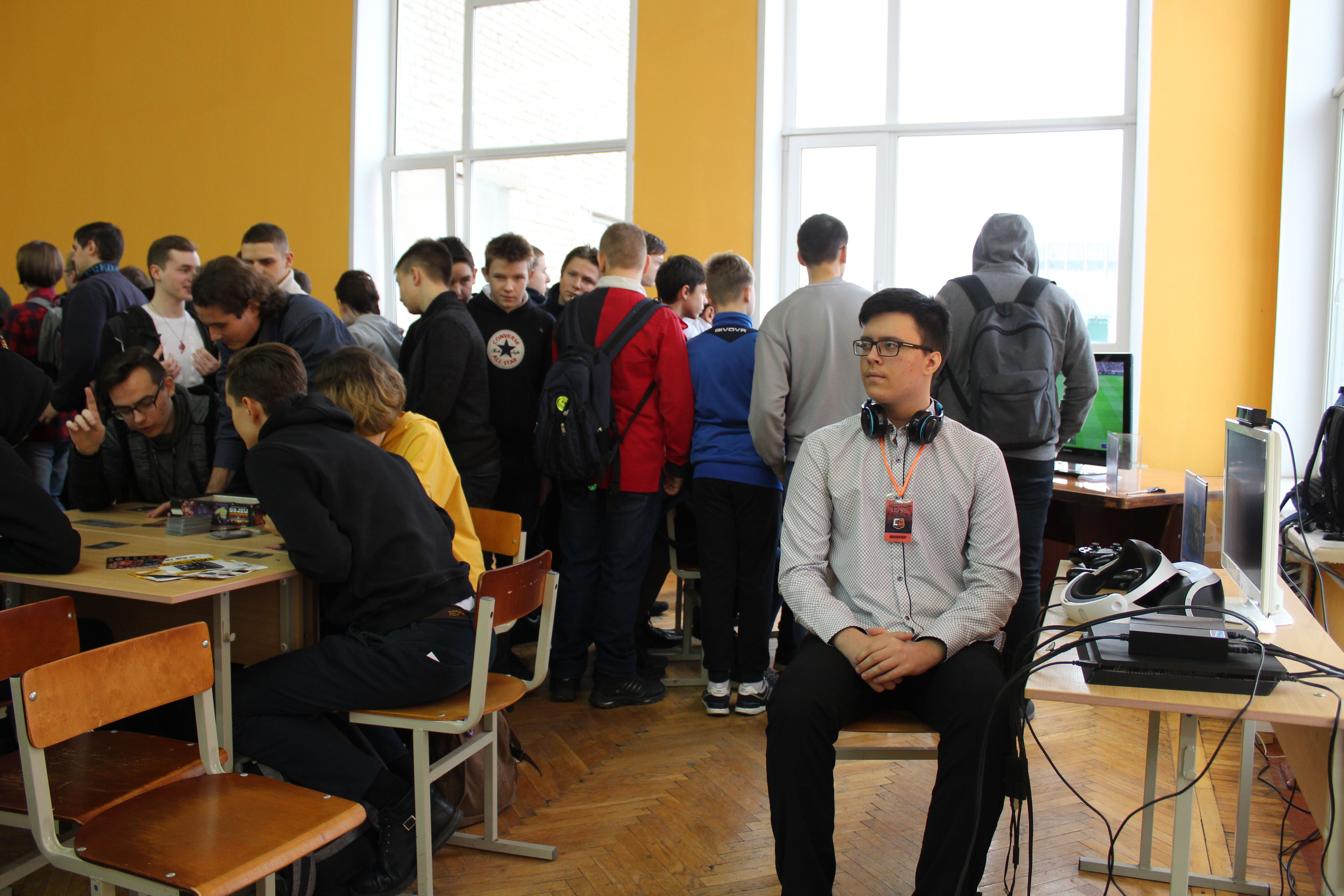 КиберФест расположился в четырёх помещениях университета – трёх компьютерных классах и библиотеке. Читальный зал на день стал игральным: в нём расположились не только два больших экрана с местами для зрителей, но и несколько площадок для настольных игр, два Secret Shop-а, игровые компьютеры и VR-устройство – вероятно, единственное на всю гомельскую область. Ну и куда же без атмосферы (в прямом и переносном смысле) тесного компьютерного клуба!