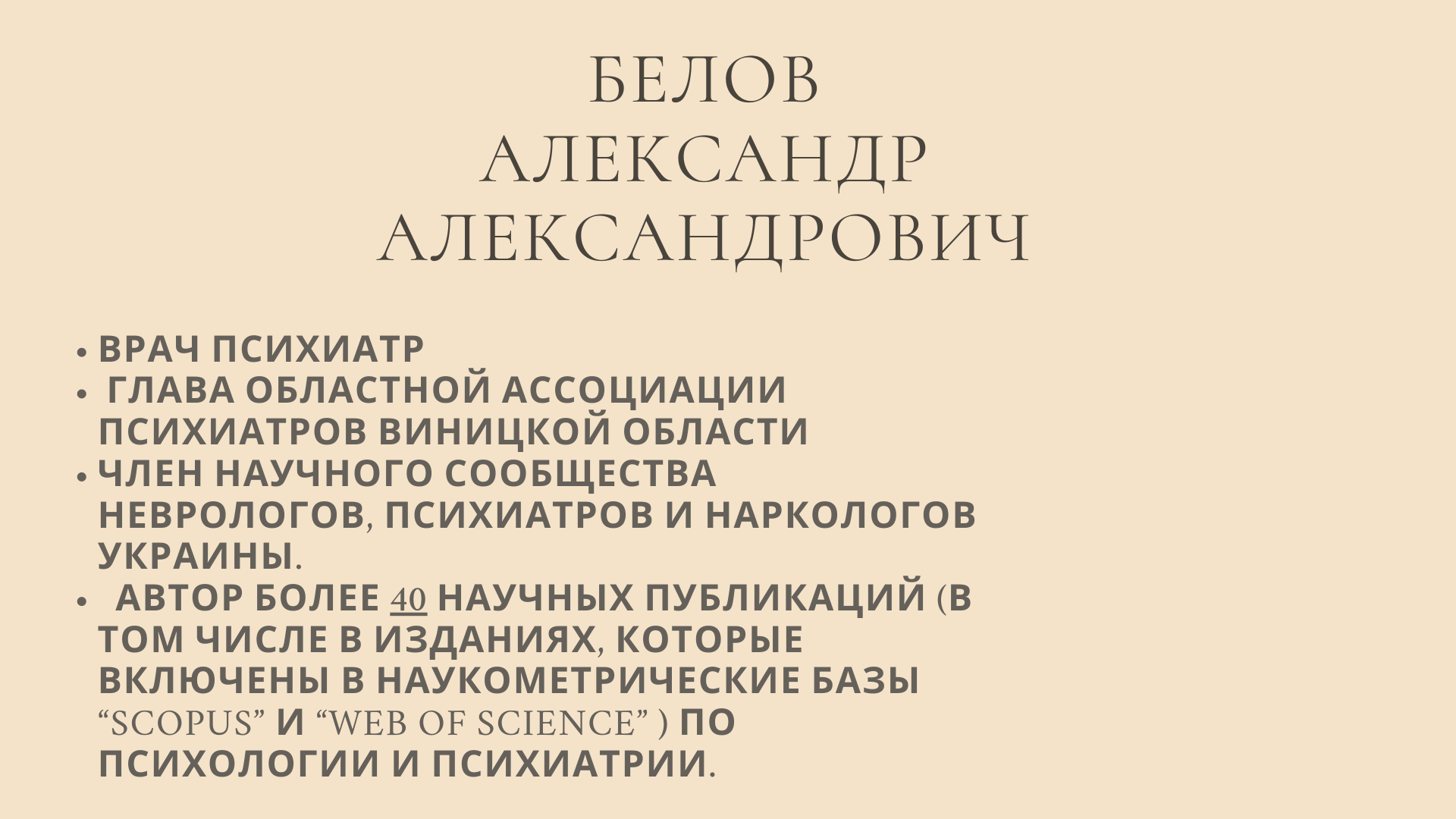 - Здравствуйте, я Белов Александр Александрович- Доцент кафедры медицинской психологии и психиатрии ВНМУ им. Н.И. Пирогова, а также кандидат медицинских наук.