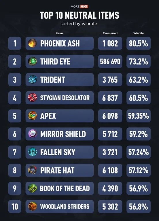 Эти предметы исчезают после смерти владельца, поэтому их винрейт сильно завышен. В большинстве матчей проигрывающие команды не смогут сохранить эти артефакты. В первую пятерку по винрейту также вошли Trident (63,2%), Stygian Desolator (60,5%) и Apex (59,35%).