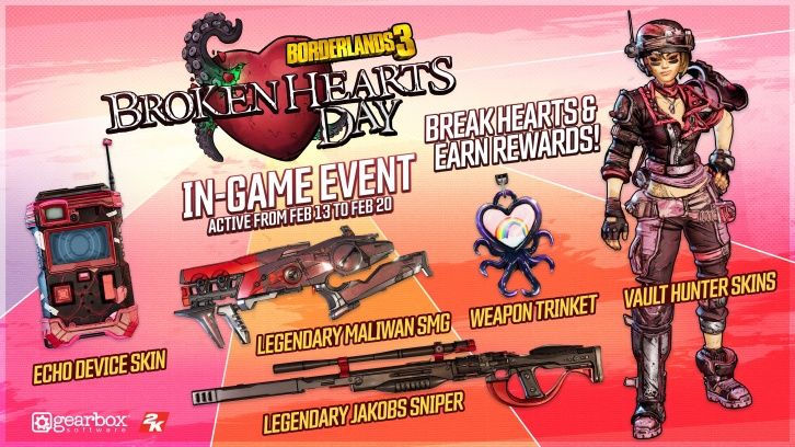 В Borderlands 3 пройдет временное событие «День разбитых сердец», посвященное Дню святого Валентина. Оно состоится 13–20 февраля. Вместе с праздником в игре поднимется максимальный уровень игрока — с 50-го до 53-го — и появятся два новых оружия и скина.