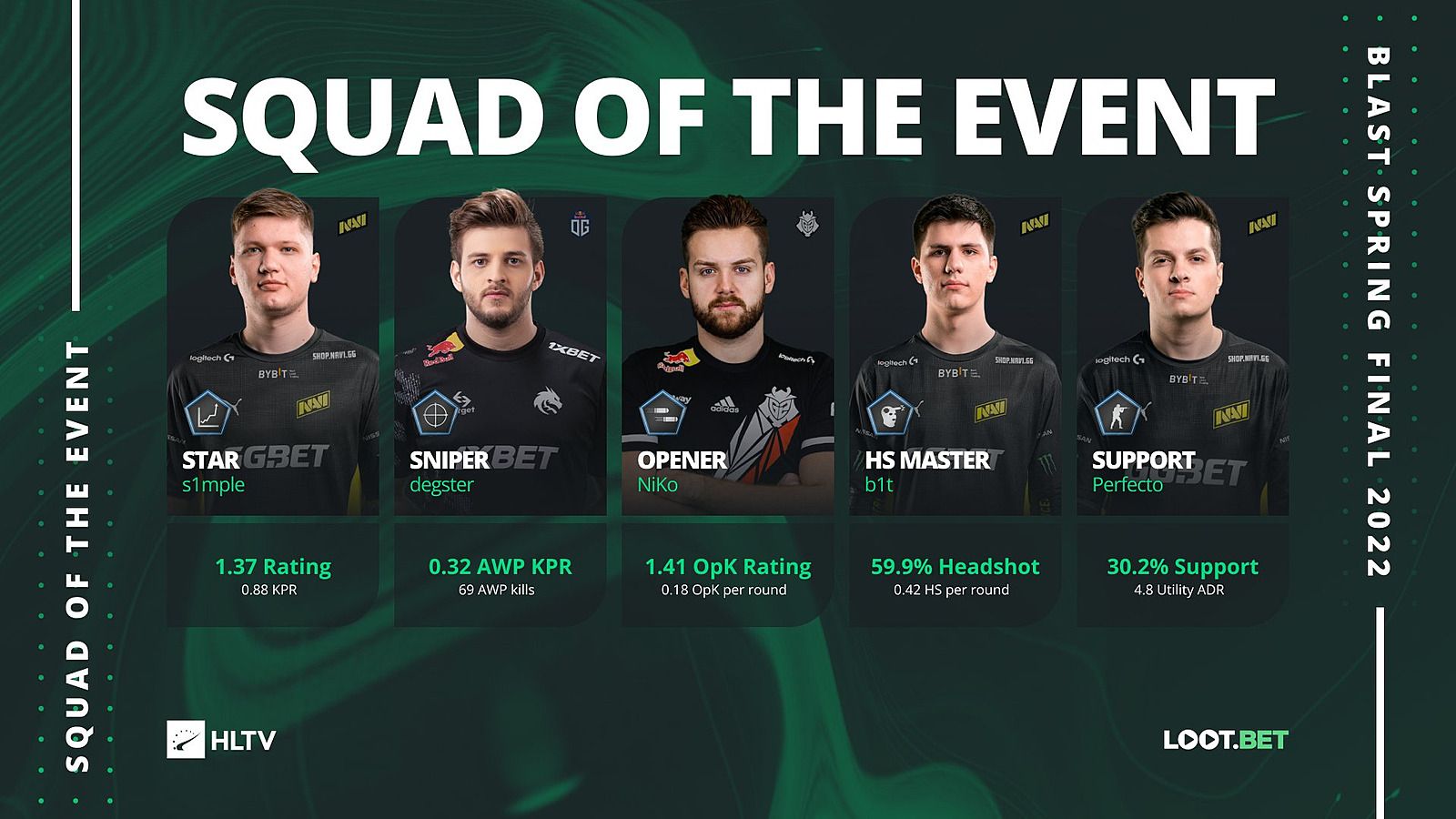 S1mple признали лучшим игроком турнира. Degster отметили за выступление со снайперской винтовкой: он сделал 69 убийств из AWP с показателем 0,32 фрага за раунд. Тиммейт Костылева b1t стал самым точным стрелком на чемпионате с результатом 59,9% хедшотов, а Perfecto, еще один участник NAVI, оказался наиболее эффективным саппортом. В пятерку лучших игроков соревнования также попал Никола NiKo Ковач из G2 Esports. Боснийский киберспортсмен чаще других совершал первые убийства в раундах.