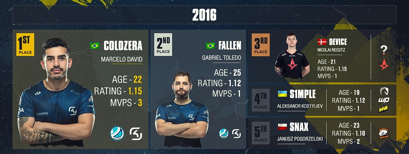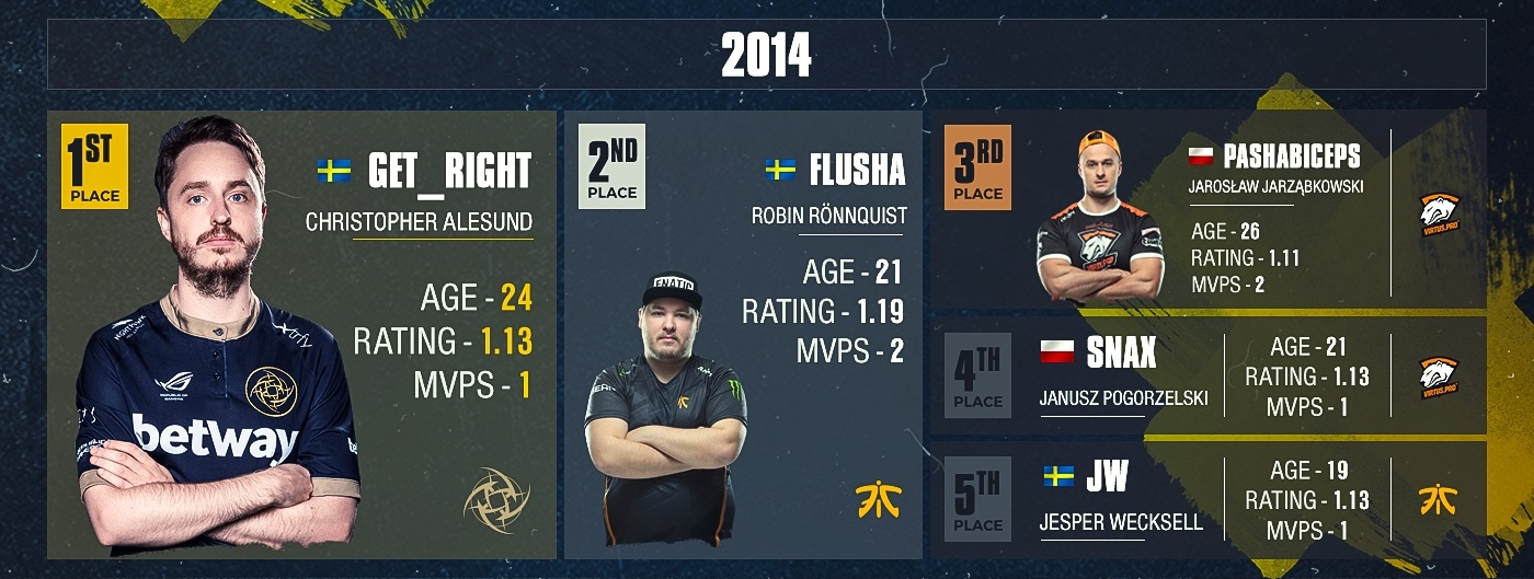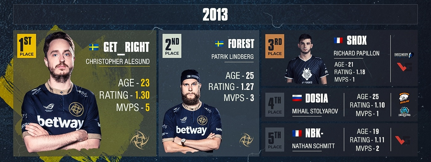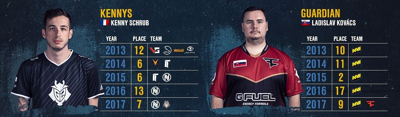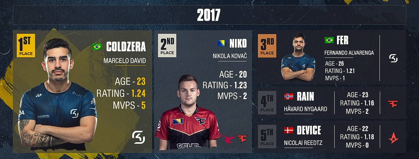 Кенни kennyS Шраб и Ладислав GuardiaN Ковач занимали места в каждом рейтинге с 2013 по 2017 год. Кристофер GeT_RiGhT Алесунд и Марсело coldzera Давид дважды становились первыми. В 2015 году высшую строчку занял Олоф olofmeister Кайбьер.