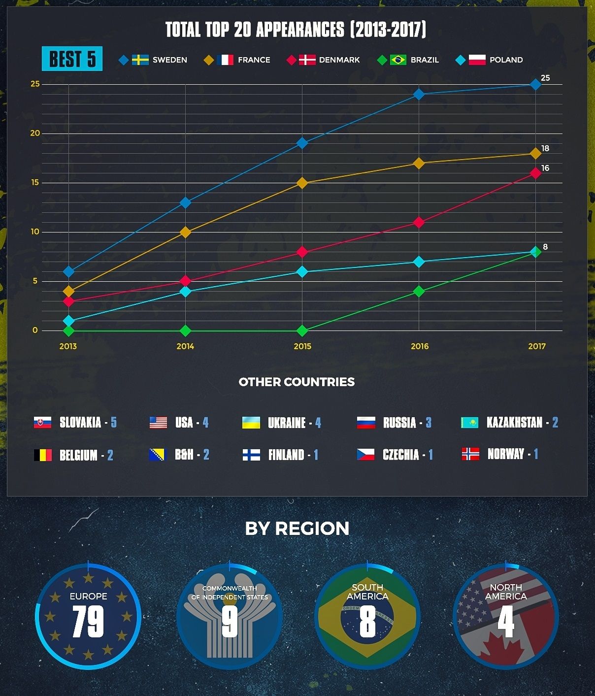 Самой богатой на таланты страной была и остается Швеция: за пять лет 25 раз игроки из этой страны попадали в двадцатку лучших. Следом идут Франция, Дания, Бразилия и Польша. Всего в топ-20 79 раз входили игроки из самого титулованного региона — Европы.