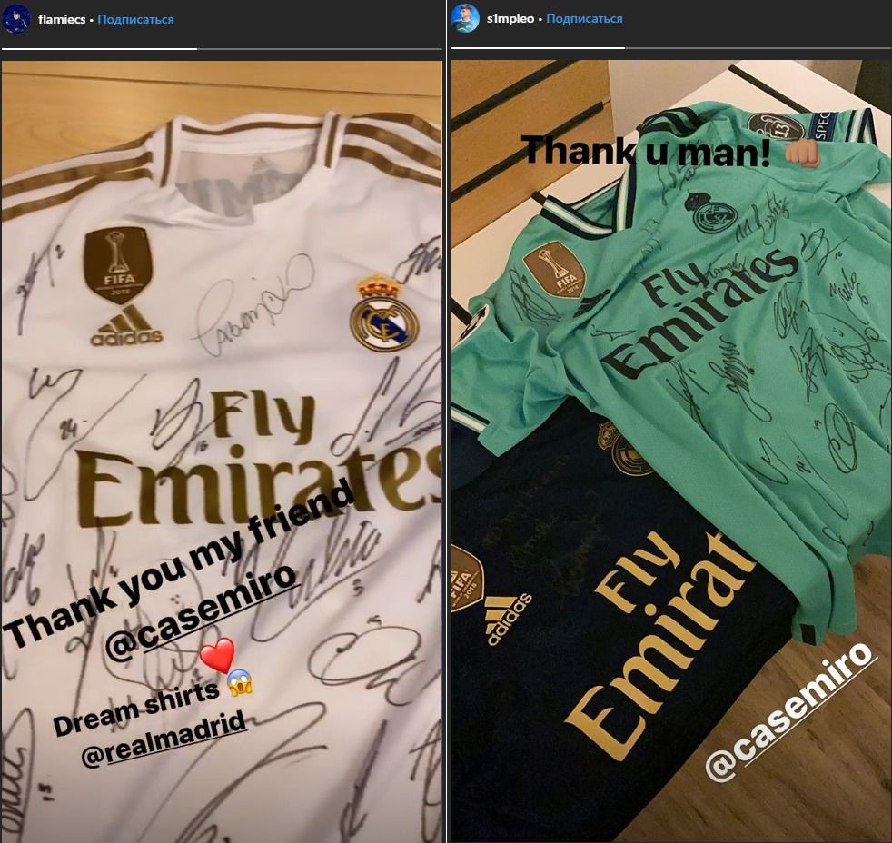 Футболист «Реал Мадрида» Каземиро подарил Александру s1mple Костылеву и Егору flamie Васильеву футболки с автографами одноклубников. Фотографии презентов игроки команды Natus Vincere по CS:GO опубликовали в историях в Instagram.