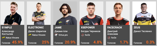 25% голосов в номинации «Лучший игрок 2019 года в CS:GO в СНГ» набрал Денис electroNic Шарипов — он уступил Костылеву на 20,9%. На третьей строчке — Джами Jame Али. В топ-10 по версии пользователей также вошли Алексей Qikert Голубев и Даурен AdreN Кыстаубаев — они набрали по 0,2% голосов, а Андрей Jerry Мехряков и Михаил Dosia Столяров — по 0,1% голосов.