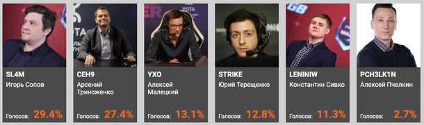 Среди комментаторов CS:GO второе место занял Арсений ceh9 Триноженко — он набрал 27,4% голосов и опередил Алексея yXo Малецкого на 14,3%. В топ-10 также оказались Александр Enkanis Полищук, Тауфик Tafa Хидри, Михаил okpOxa Шмыгель и Сергей Smile Ревин.