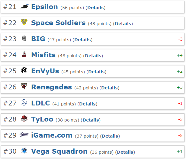 В третьей десятке кроме Vega Squadron выше поднялись Misfits, Team EnVyUs и Renegades. Коллектив iGame.com опустился на 5 строчек и занял 29 место рейтинга.