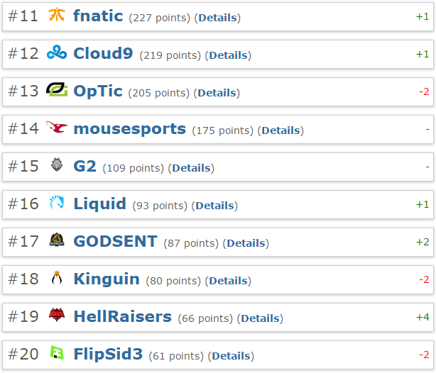 Вплотную к топ-10 приблизились fnatic и Cloud9, расположившиеся на 11 и 12 месте. Позиции также улучшили Team Liquid, GODSENT и HellRaisers. FlipSid3 Tactics опустилась на две строчки и замыкает вторую десятку.