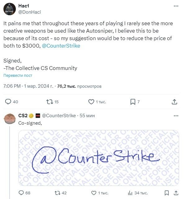 Инсайдер предположил, что основная причина того, что игроки редко выбирают «автоснайперки» — высокая стоимость оружия. Don Haci предложил разработчикам уменьшить стоимость SCAR-20 и G3SG1 с $5 тыс. до $3 тыс. Свой пост он подписал: «Комьюнити CS». На публикацию отреагировали представители Valve — официальный аккаунт Counter-Strike оставил собственную подпись под обращением.
