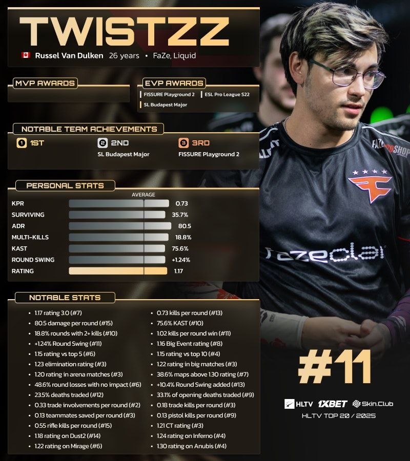 Участник FaZe Clan Рассел Twistzz Ван Далкен остановился на 11-й строчке рейтинга лучших игроков 2025 года от HLTV.org. Анонс с ключевой статистикой опубликован на сайте и в социальных сетях.