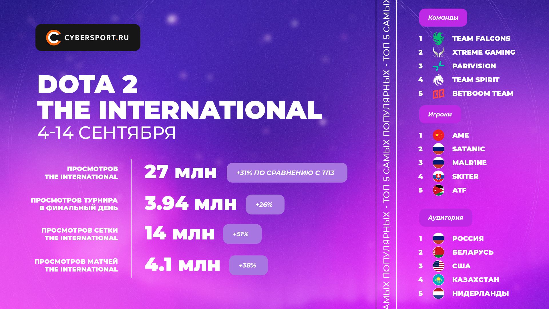 Топ-5 команд чемпионата возглавили финалисты Team Falcons и Xtreme Gaming. При этом самыми популярными игроками являются Ван Ame Чуньюй и Алан Satanic Галлямов. Большинство аудитории, интересующейся турниром, было зарегистрировано в России, Беларуси, США, Казахстане и Нидерландах.