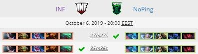 Победа на первой карте досталась NoPing e-sports — бразильцы обыграли соперников за 27 минут. В ответном матче Infamous справилась с оппонентами за 35 минут. Интересно, что на обеих картах счет по фрагам был разгромным: 41:16 и 31:14. Игроки выступали на идентичных героях и линиях.