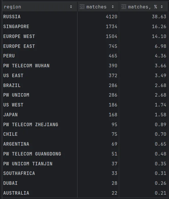 Геймер проанализировал более 10 тыс. матчей, выбранных случайным образом. Выяснилось, что более 4,1 тыс. игр пришлось на российский сервер. На втором месте локаций оказался Сингапур (16,26%), а тройку лидеров замкнула Западная Европа (14,1%). На Восточную Европу, занимающую четвертую позицию, при этом пришлось только 6,98% матчей. Наименее популярными серверами стали Южная Африка (0,3%), Дубай (0,26%) и Австралия (0,21%).