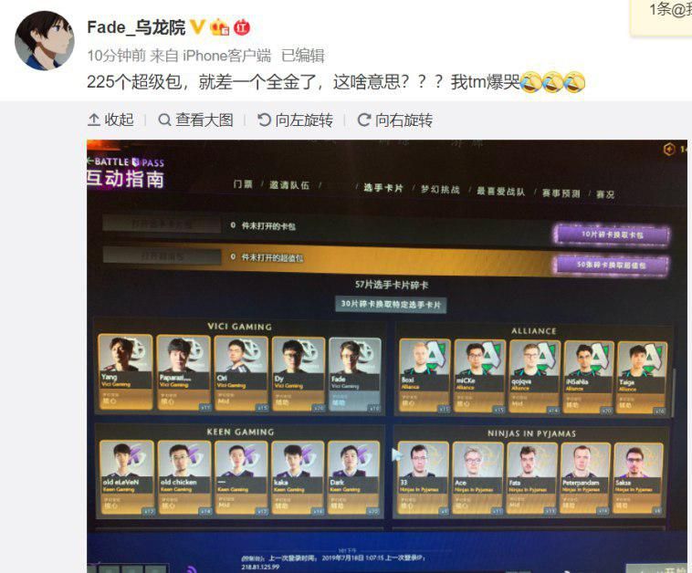 Капитан Vici Gaming Пань Fade Юй открыл 225 премиум-паков с карточками участников The International 2019 по Dota 2. Для фэнтези-лиги он собрал 17 «золотых» составов, и только для своей команды ему не хватило одного «золотого» игрока — Fade не выпала собственная карта высшего номинала. Этим забавным наблюдением Юй поделился с подписчиками в Weibo.