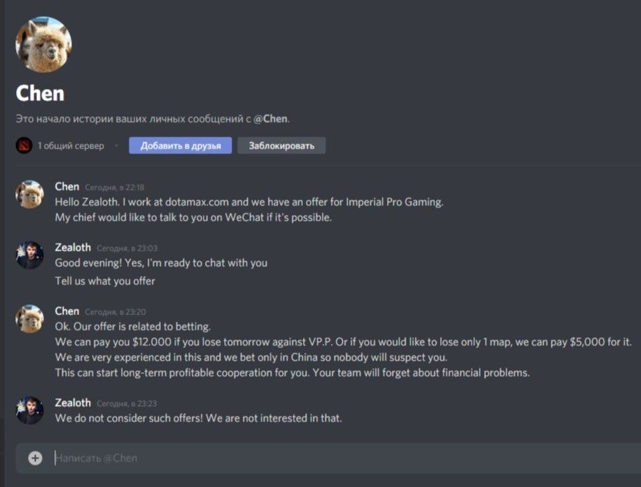 Бывший менеджер Imperial Pro Gaming Андрей Zealoth Лозинский показал переписку с представителем китайского букмекера, который предложил его команде поучаствовать в договорном матче. Мошенник обещал заплатить $12 тыс., если Imperial Pro Gaming проиграет VP.Prodigy во втором дивизионе Dota Pro Circuit 2021 для СНГ. Менеджер российской команды отказался от предложения.