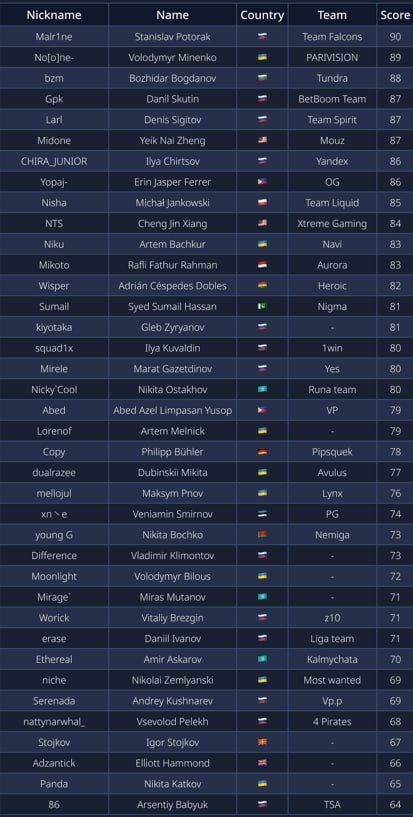 На первом месте расположился мидер Team Falcons Станислав Malr1ne Поторак. В тройку лидеров также вошли Владимир No[o]ne Миненко из PARIVISION и Божидар bzm Богданов.
