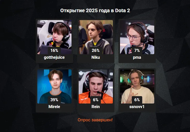 В конце прошлого года на Cybersport.ru стартовала серия опросов, посвященных итогам 2025-го в Dota 2. И первые результаты мы хотим объявить в номинации «Открытие года». В шорт-листе голосования было шесть претендентов. И победителем вы выбрали Марата Mirele Газетдинова — молодого мидера, который по ходу прошлого сезона был стендином Team Spirit на одном из ивентов, где команда завоевала серебро. В опросе он набрал 39% голосов. Редакция Cybersport.ru поздравляет Mirele с победой.