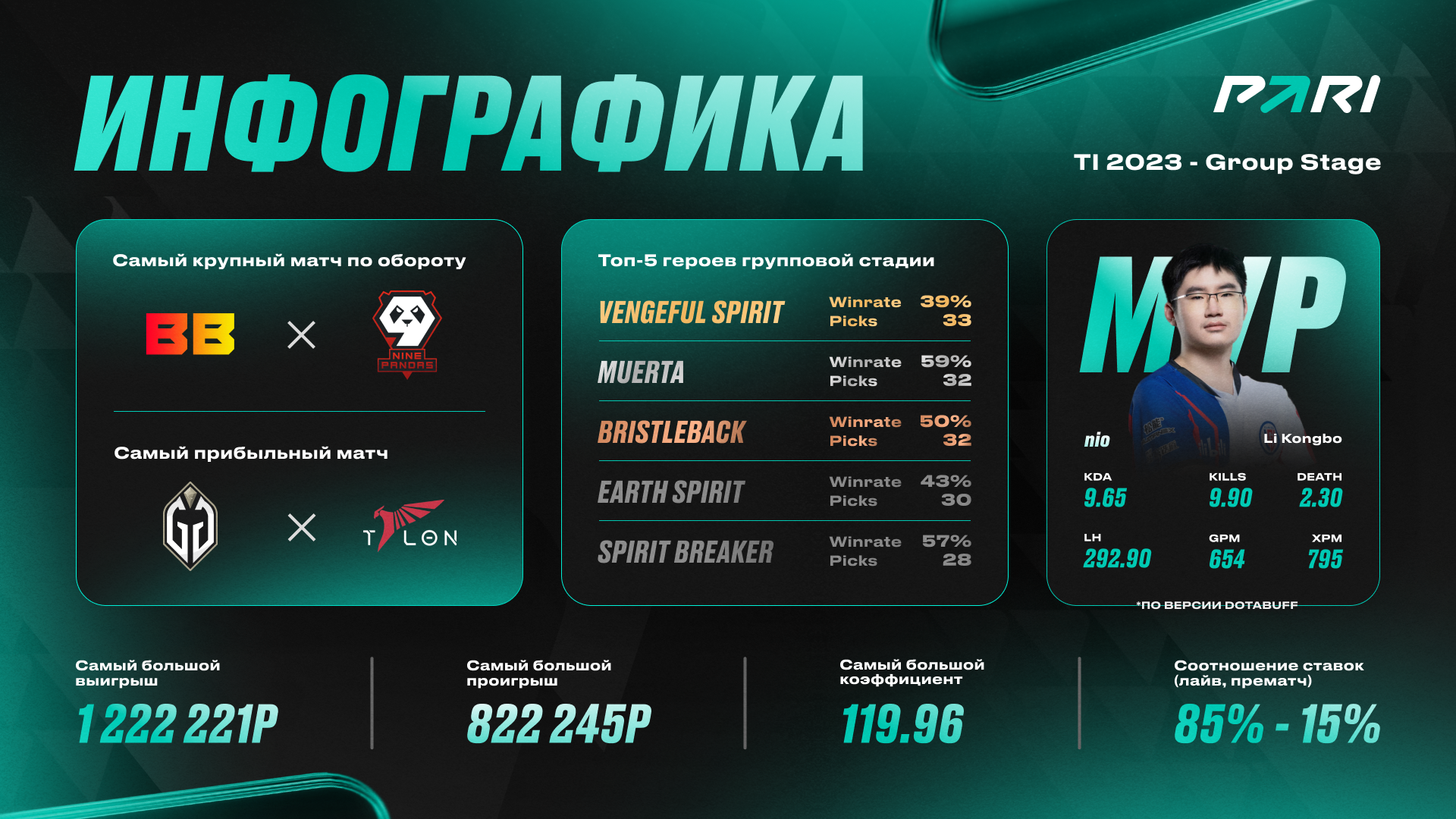 Клиент букмекерской компании PARI заработал почти ₽600 тыс. после ставки в ₽5 тыс. на экспресс из пяти исходов матчей The International 2023 по Dota 2. Об этом представители БК сообщили в пресс-релизе.