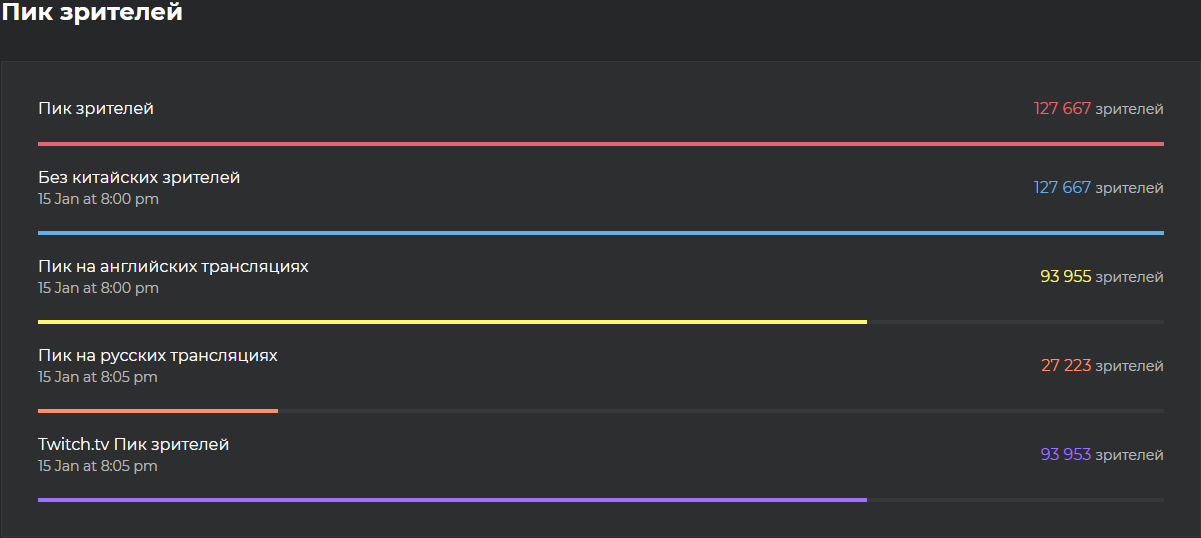 Максимальное число одновременных зрителей на русскоязычных стримах составило 27 223. Из них 25 967 человек смотрели трансляцию Виталия v1lat Волочая.