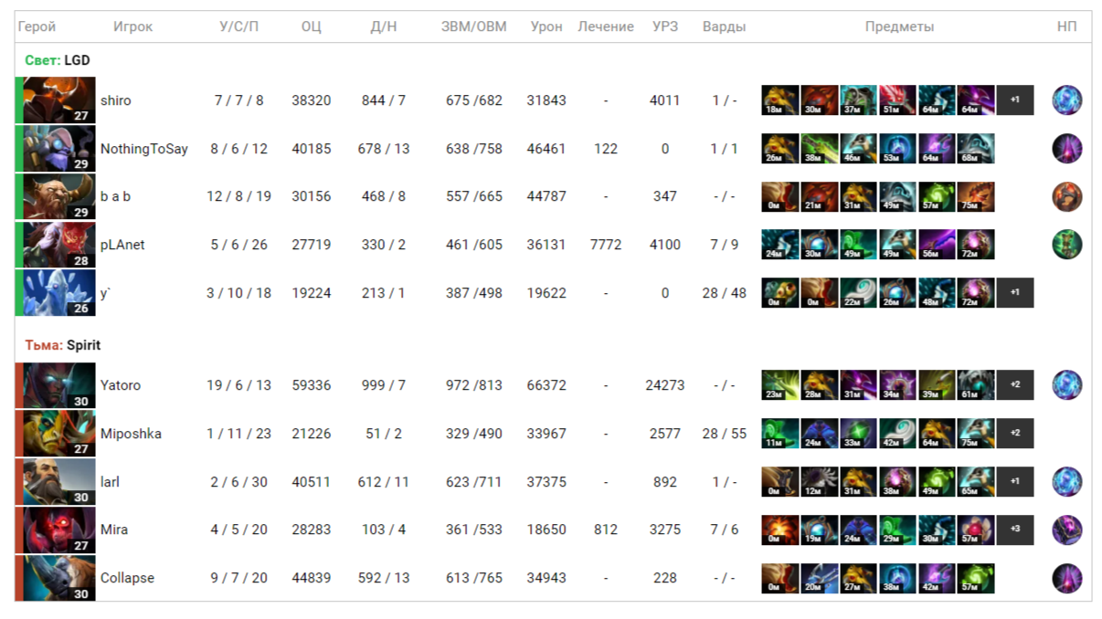 Проблема героя все та же — слабый старт. Несмотря на то что Spirit не задавила NothingToSay на линии (за первые полчаса он всего раз отправился в таверну), мидер LGD так и не смог набрать необходимый темп. Причина довольно простая: в отличие от матчмейкинга, на профессиональной сцене так фривольно толкать линии не получится, а лесной фарм в большинстве своем остается керри. В итоге за карту NothingToSay ни разу не поднялся выше третьего места по общей ценности.