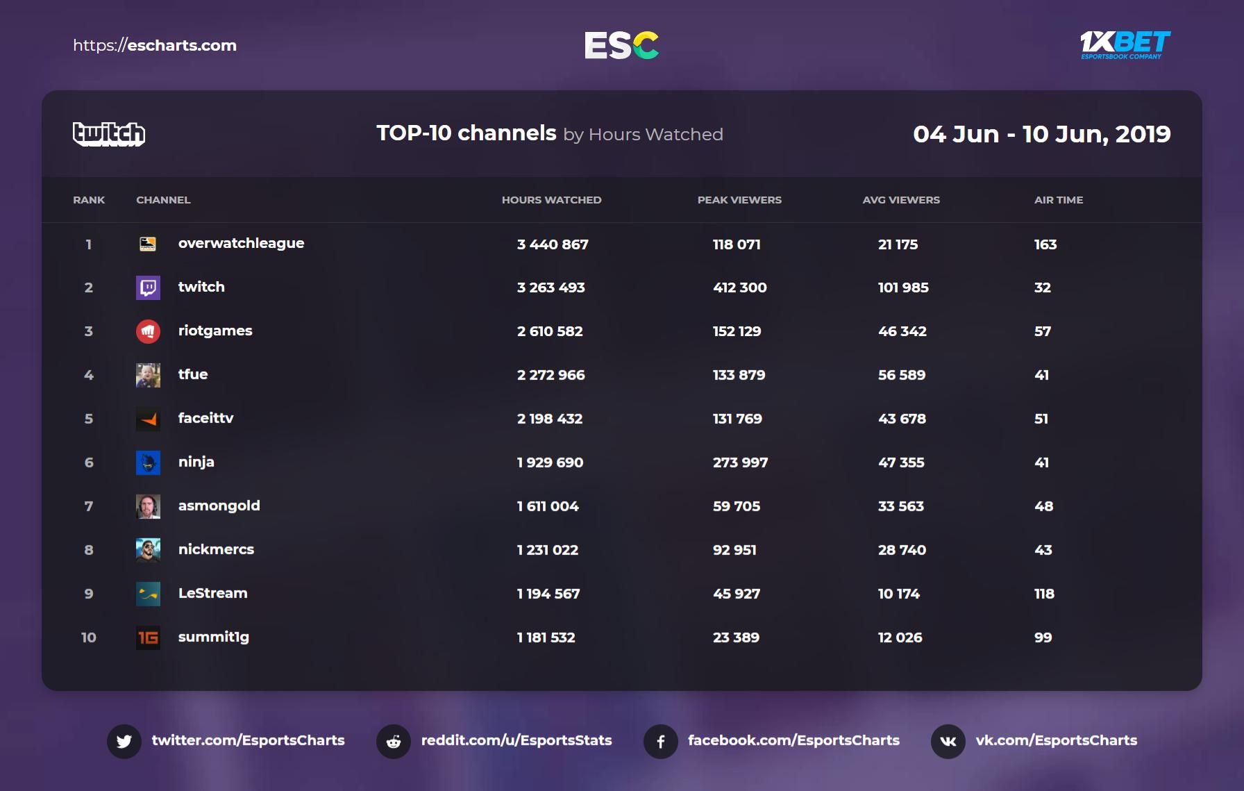 В тройку самых популярных каналов за период с 4 по 10 июня вошли стримы Overwatch League и Riot Games, а также основная трансляция Twitch, где последнюю неделю показывали презентации с выставки E3. Замкнул топ-5 канал FACEIT — с 6 по 9 июня на нем транслировали матчи LAN-финал ECS Season 7.