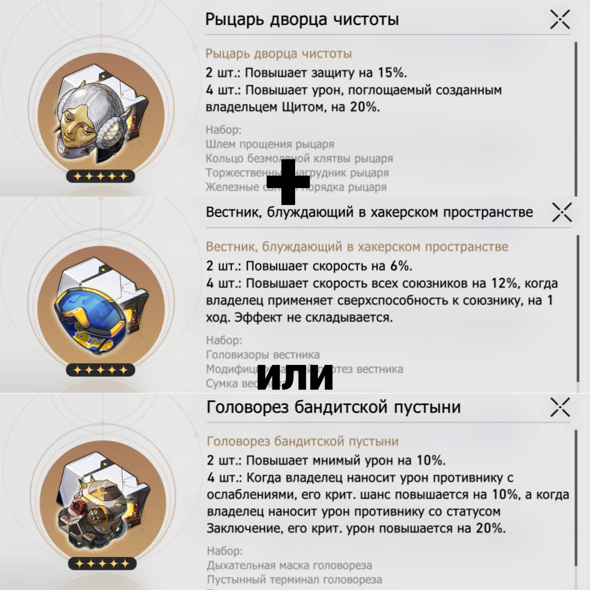 «Рыцарь дворца чистоты» / «Вестник, блуждающий в хакерском пространстве» или «Головорез бандитской пустыни» — идеальное сочетание для Авантюрина. Комбинация этих наборов сможет не только усилить щит героя, но и повысить его скорость (если взять «Вестника» как второй компонент), либо усилить мнимый урон персонажа на позиции саб-ДД (если взять «Головореза»).