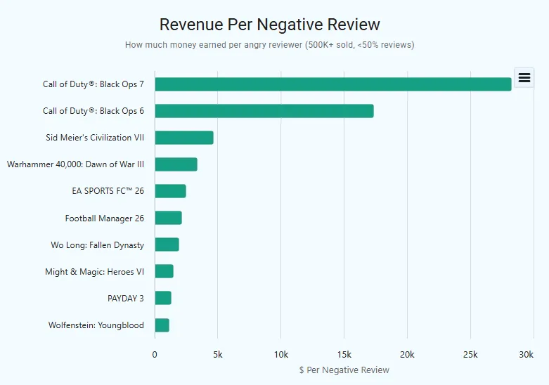 Аналитики подсчитывали количество негативных оценок (менее 50% рейтинга) Black Ops 7, а затем сравнивали их с общим объемом проданных копий. Например, по данным SteamDB, 41,6% пользователей оставили отрицательный обзор. Несмотря на это, продажи шутера настолько масштабны, что Activision все равно зарабатывает около $28 тыс. на каждый негативный отзыв.