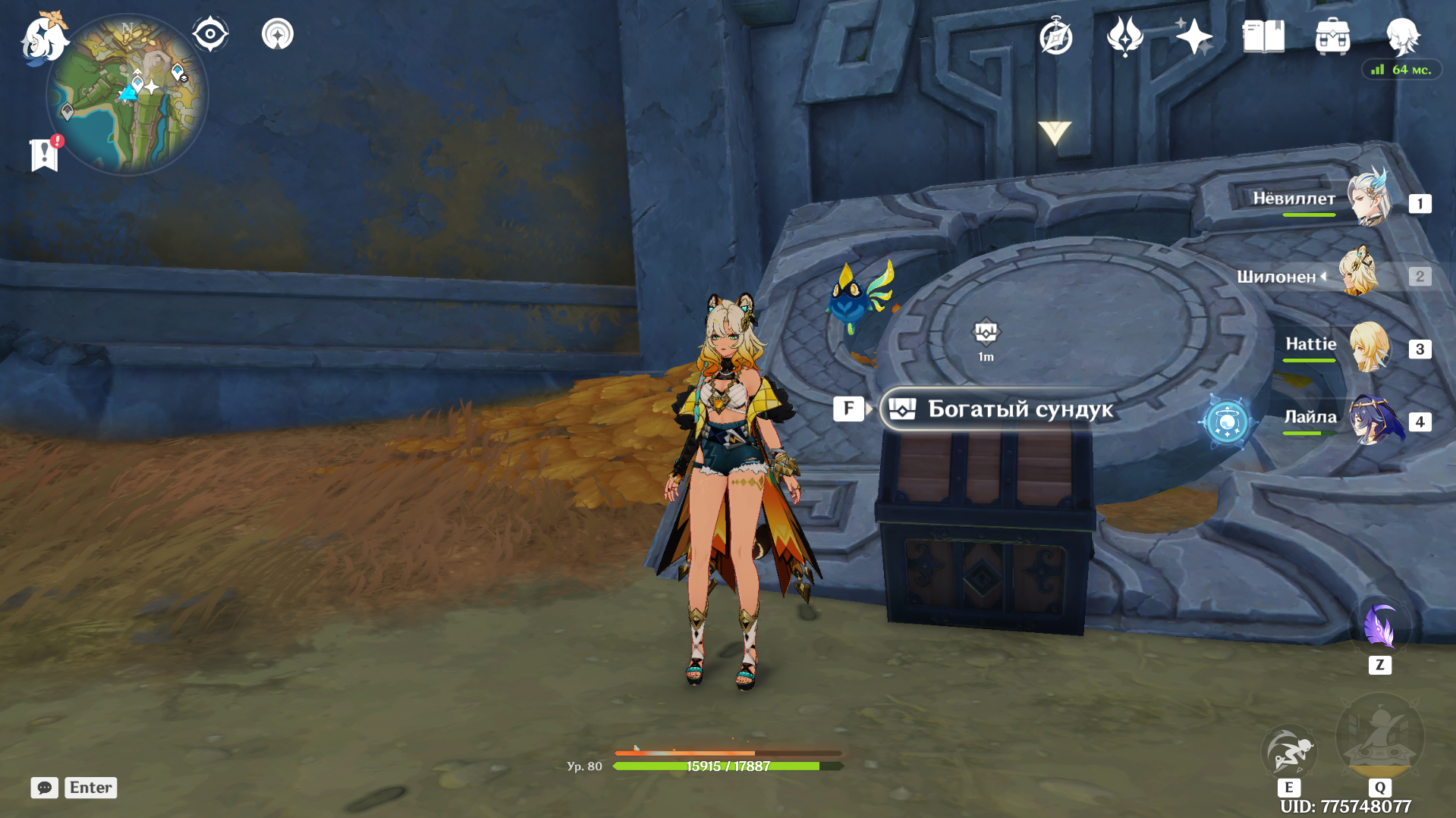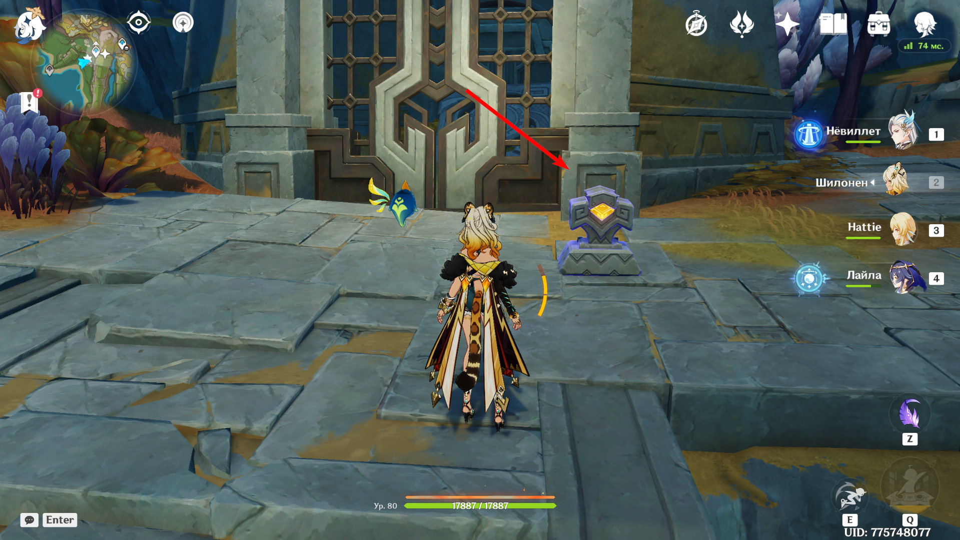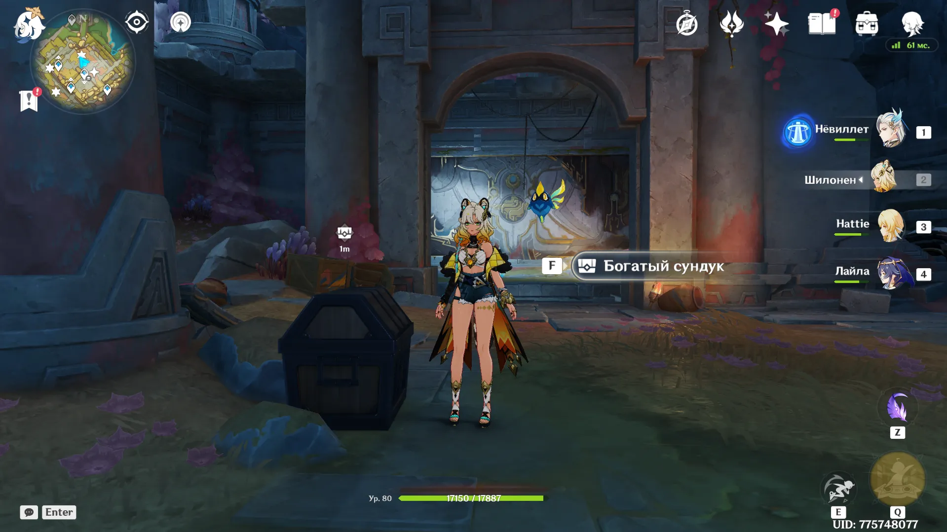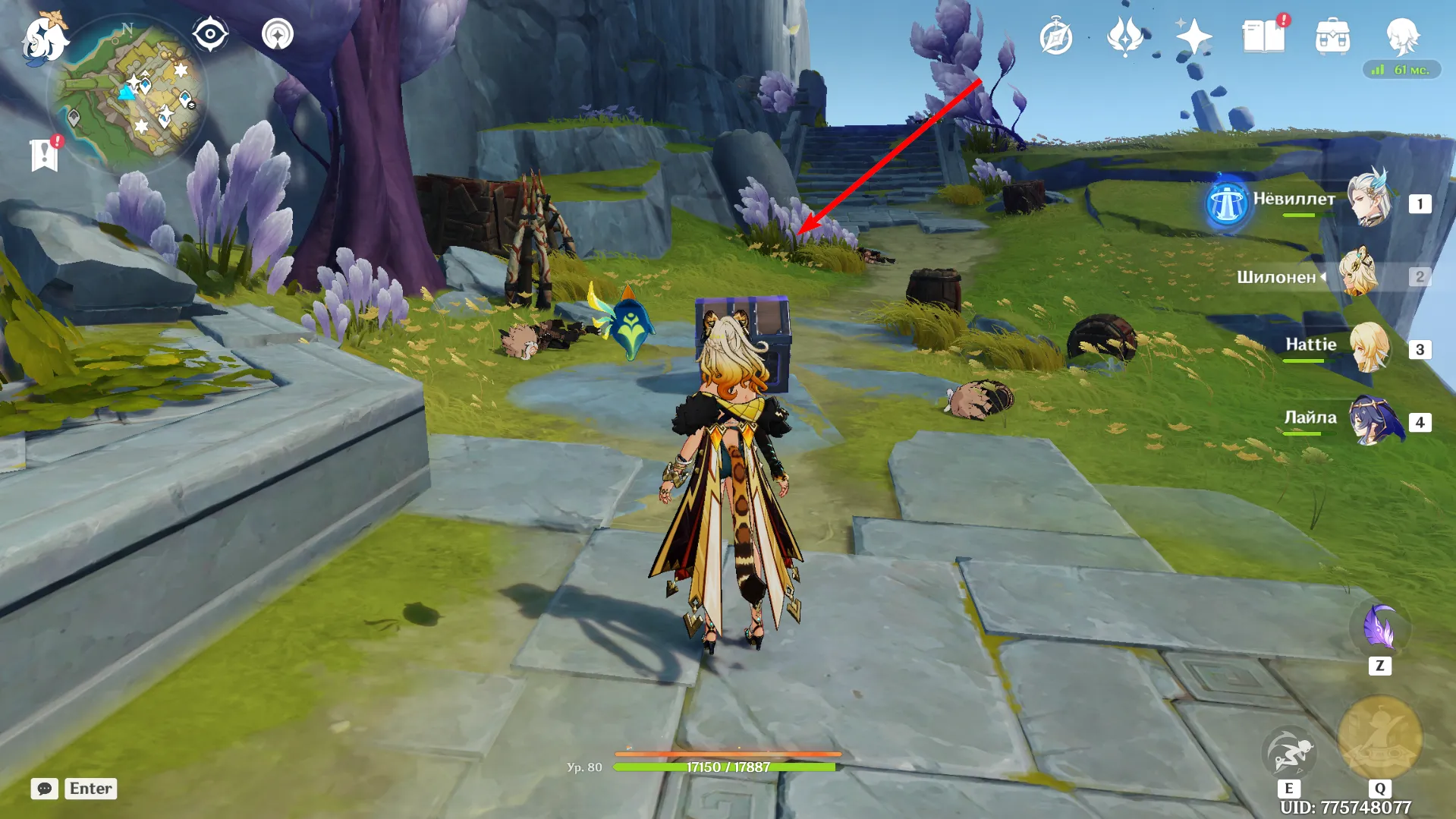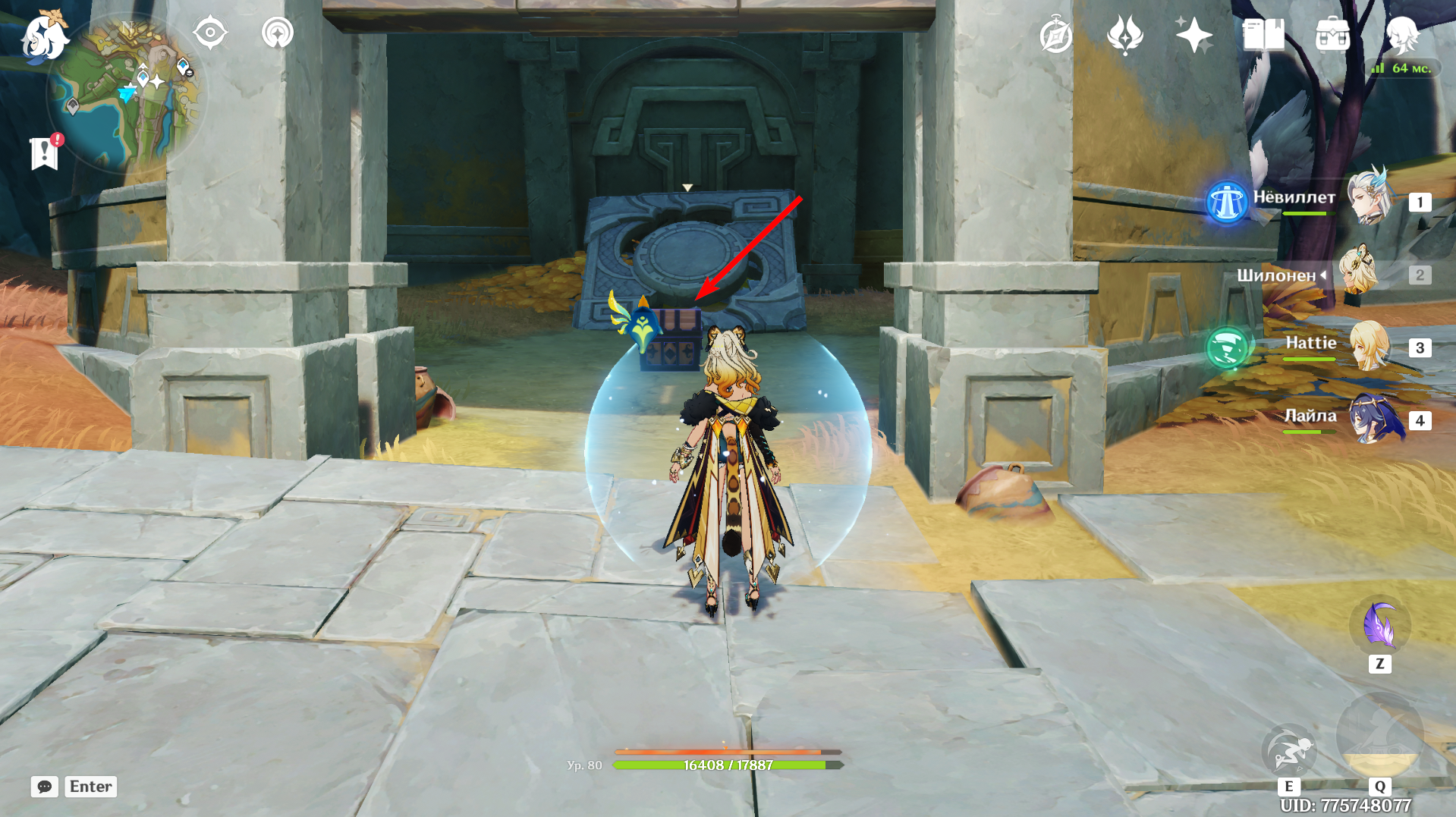 Вернитесь к предыдущему телепорту, но пройдите в этот раз немного западнее и прыгайте вниз. Возле группы погибших хиличурлов в руинах вы увидите богатый сундук, окутанный фиолетовым светом. Откройте его и одолейте первую мимифлору вместе с подоспевшим на помощь Кенином. Мужчина вновь попросит покинуть эти опасные места, а вы сможете забрать уже настоящую сокровищницу.