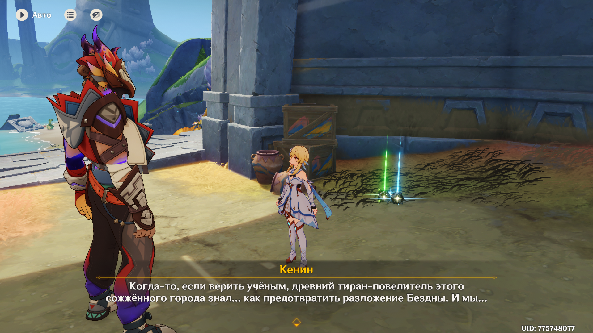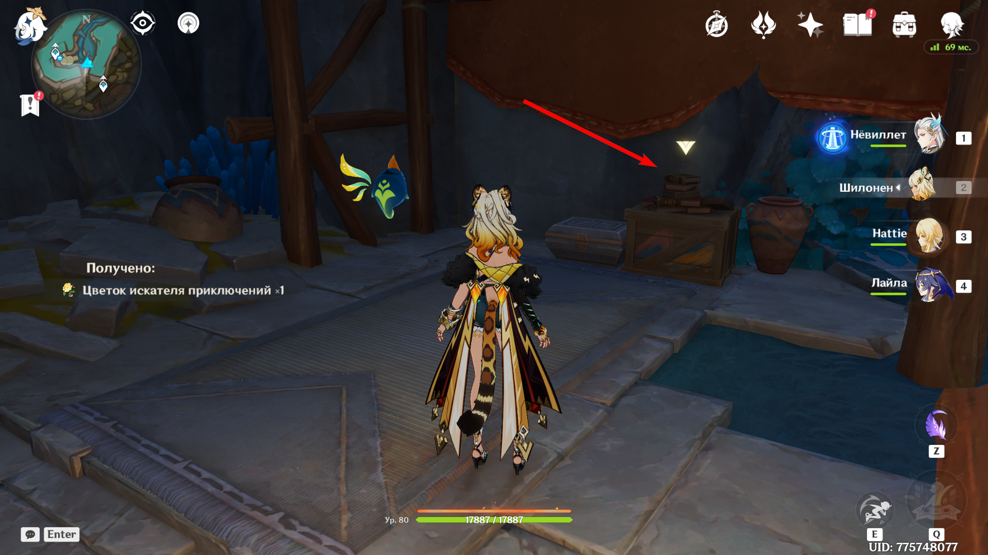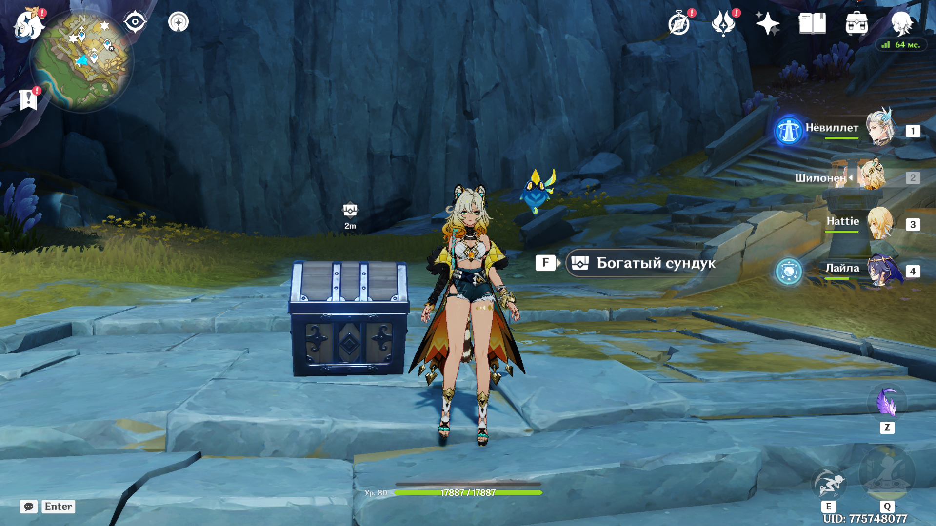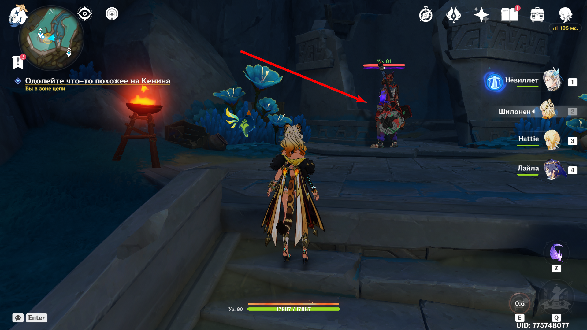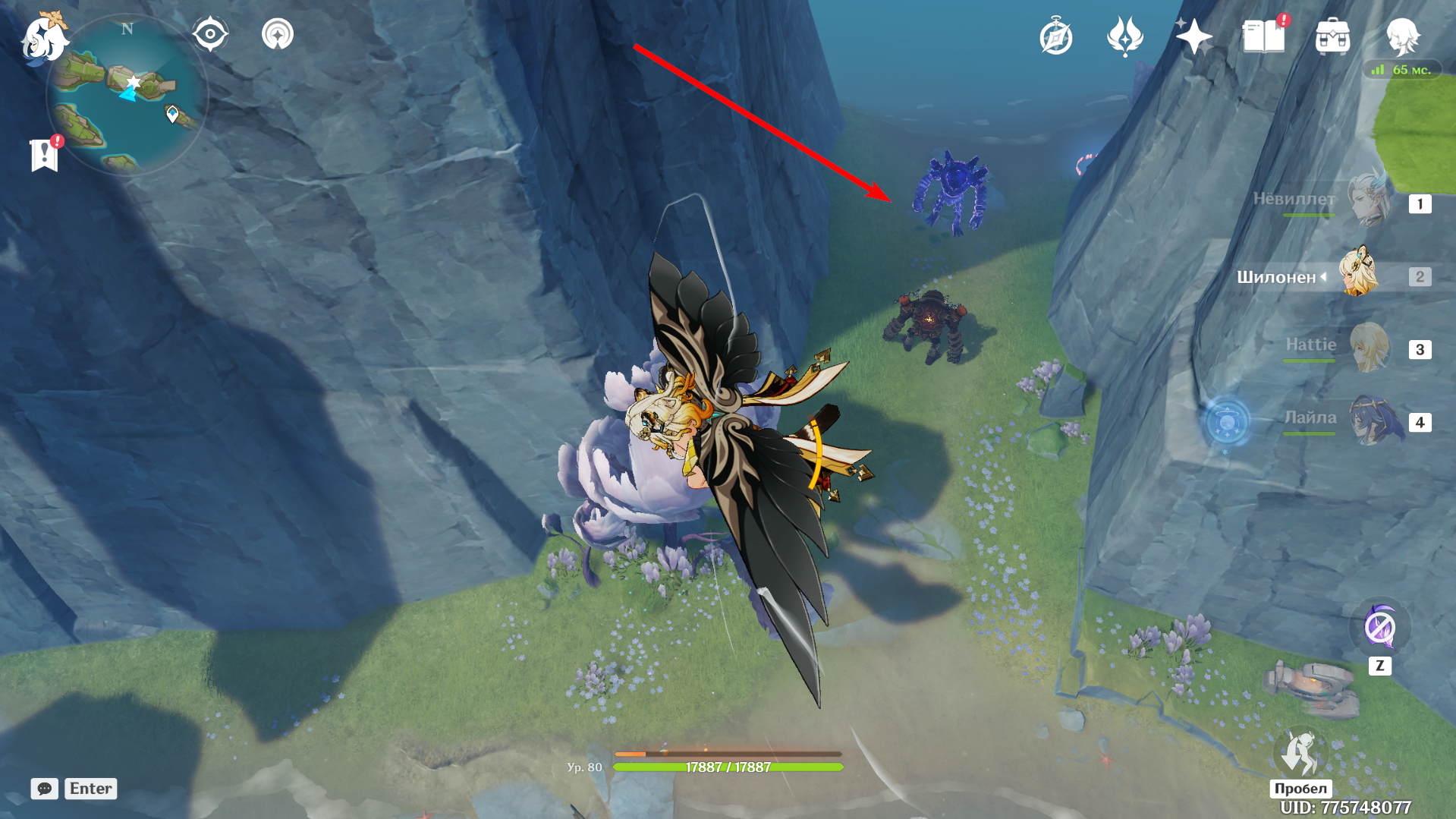 Вернитесь к предыдущему телепорту, но пройдите в этот раз немного западнее и прыгайте вниз. Возле группы погибших хиличурлов в руинах вы увидите богатый сундук, окутанный фиолетовым светом. Откройте его и одолейте первую мимифлору вместе с подоспевшим на помощь Кенином. Мужчина вновь попросит покинуть эти опасные места, а вы сможете забрать уже настоящую сокровищницу.