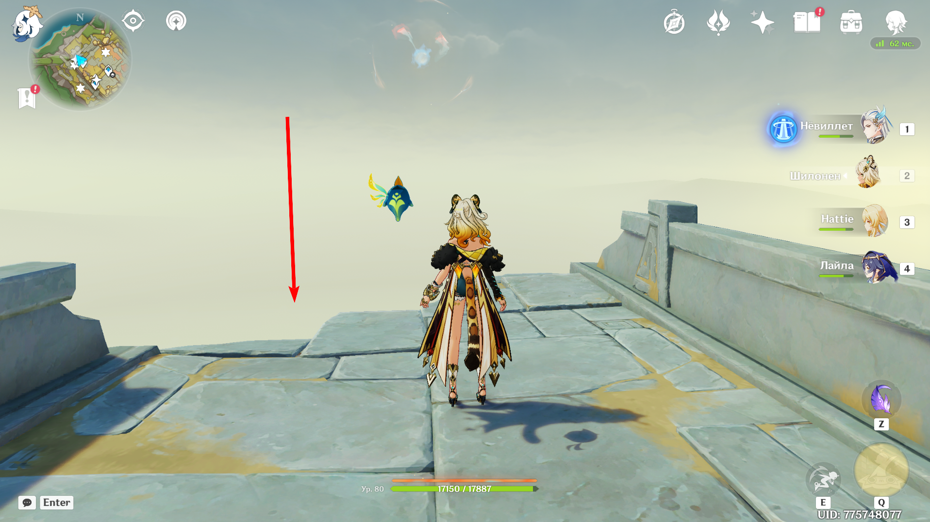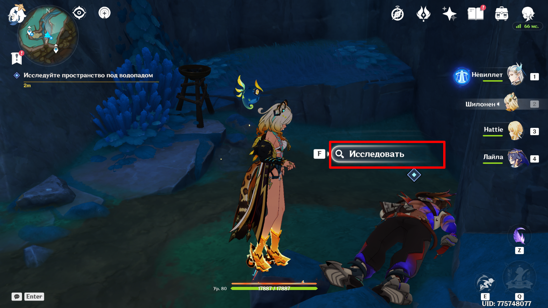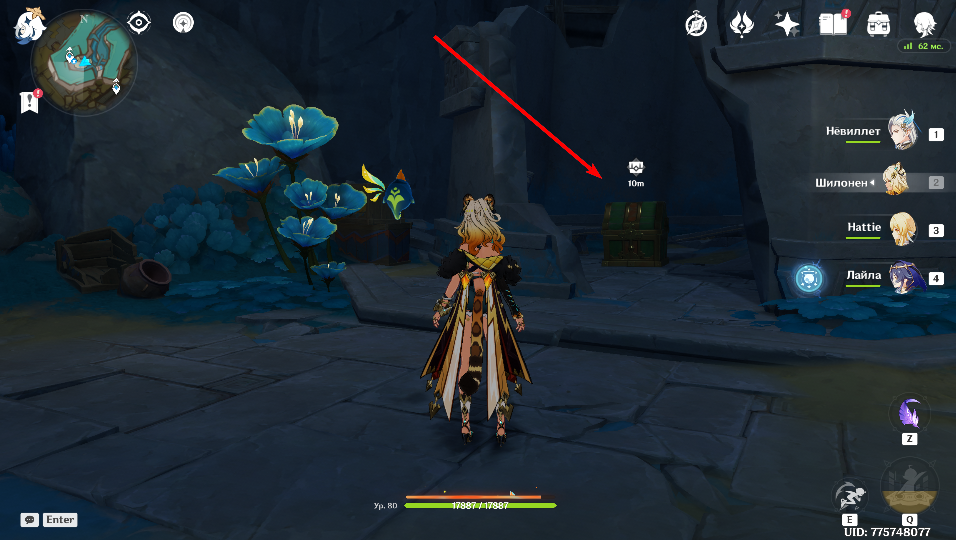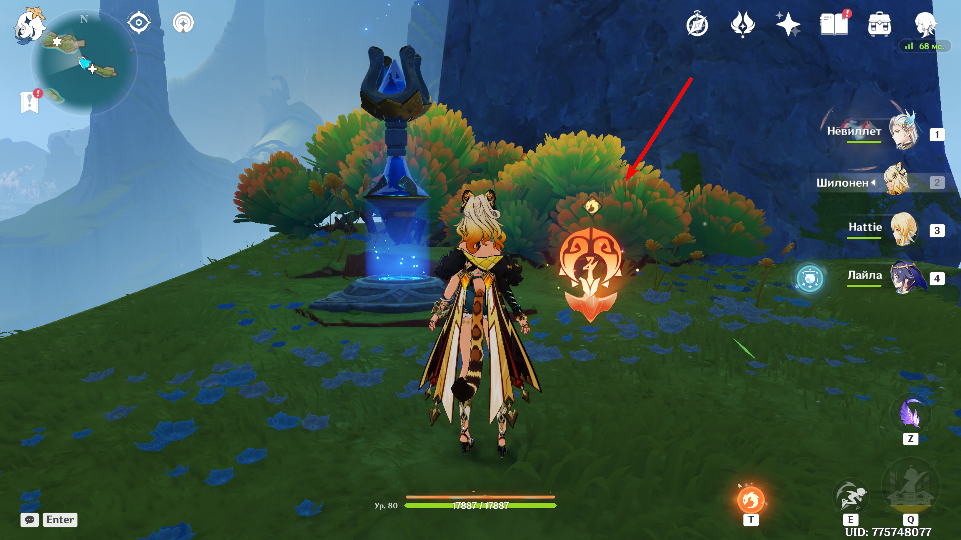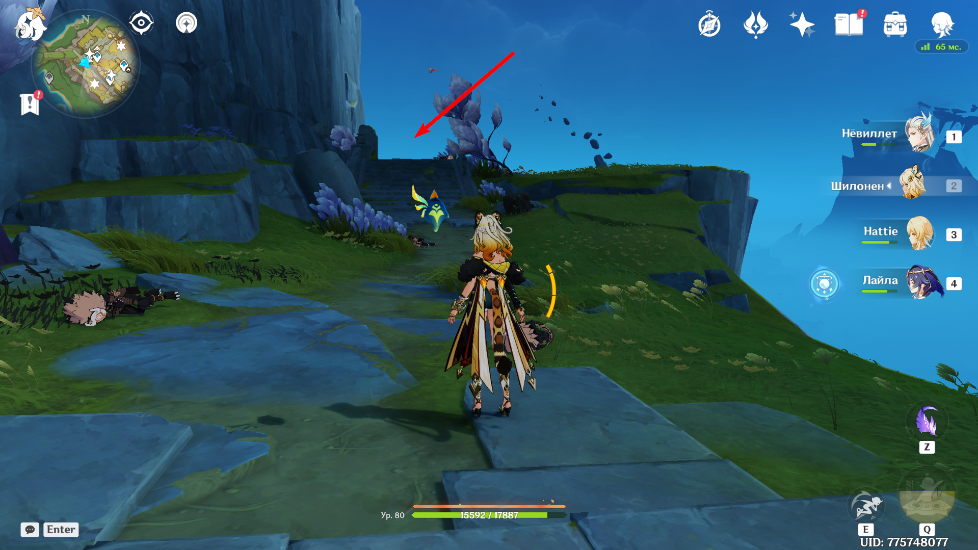 Вернитесь к предыдущему телепорту, но пройдите в этот раз немного западнее и прыгайте вниз. Возле группы погибших хиличурлов в руинах вы увидите богатый сундук, окутанный фиолетовым светом. Откройте его и одолейте первую мимифлору вместе с подоспевшим на помощь Кенином. Мужчина вновь попросит покинуть эти опасные места, а вы сможете забрать уже настоящую сокровищницу.
