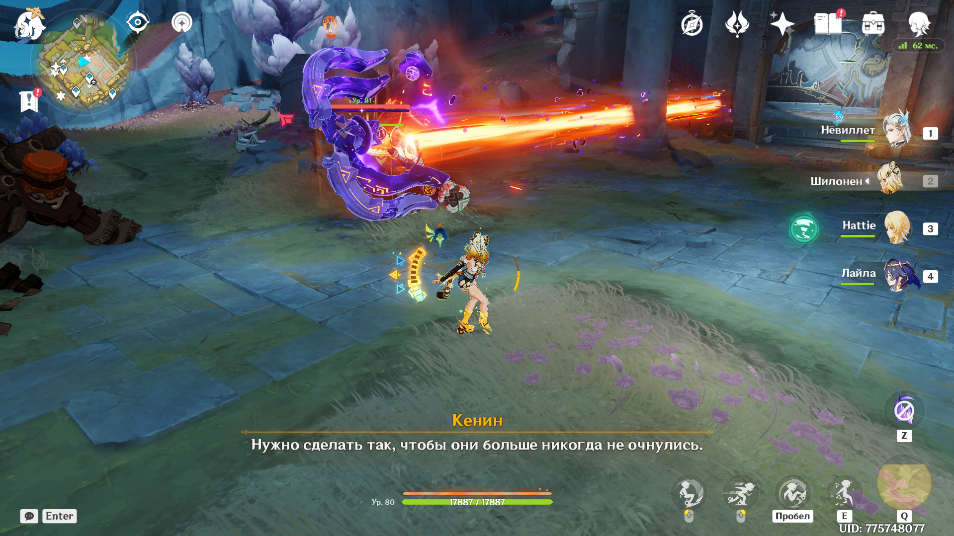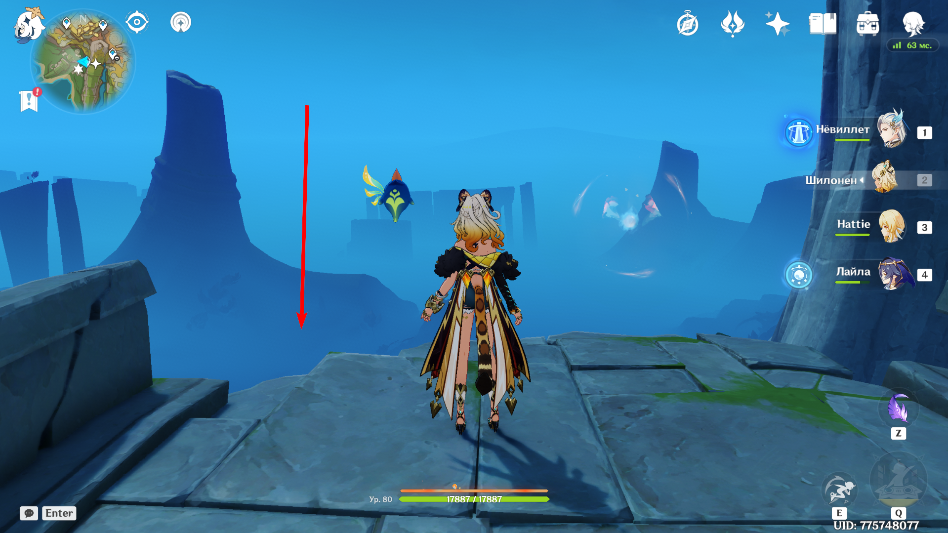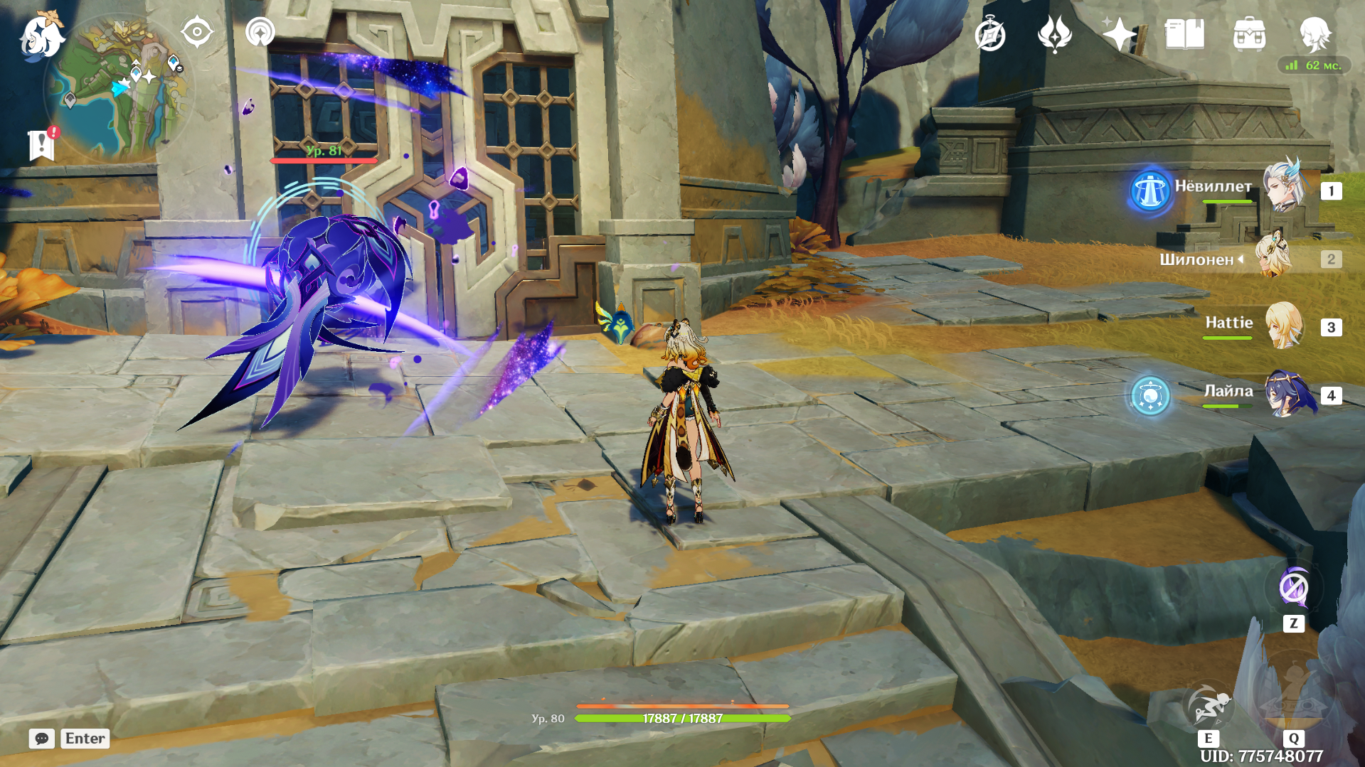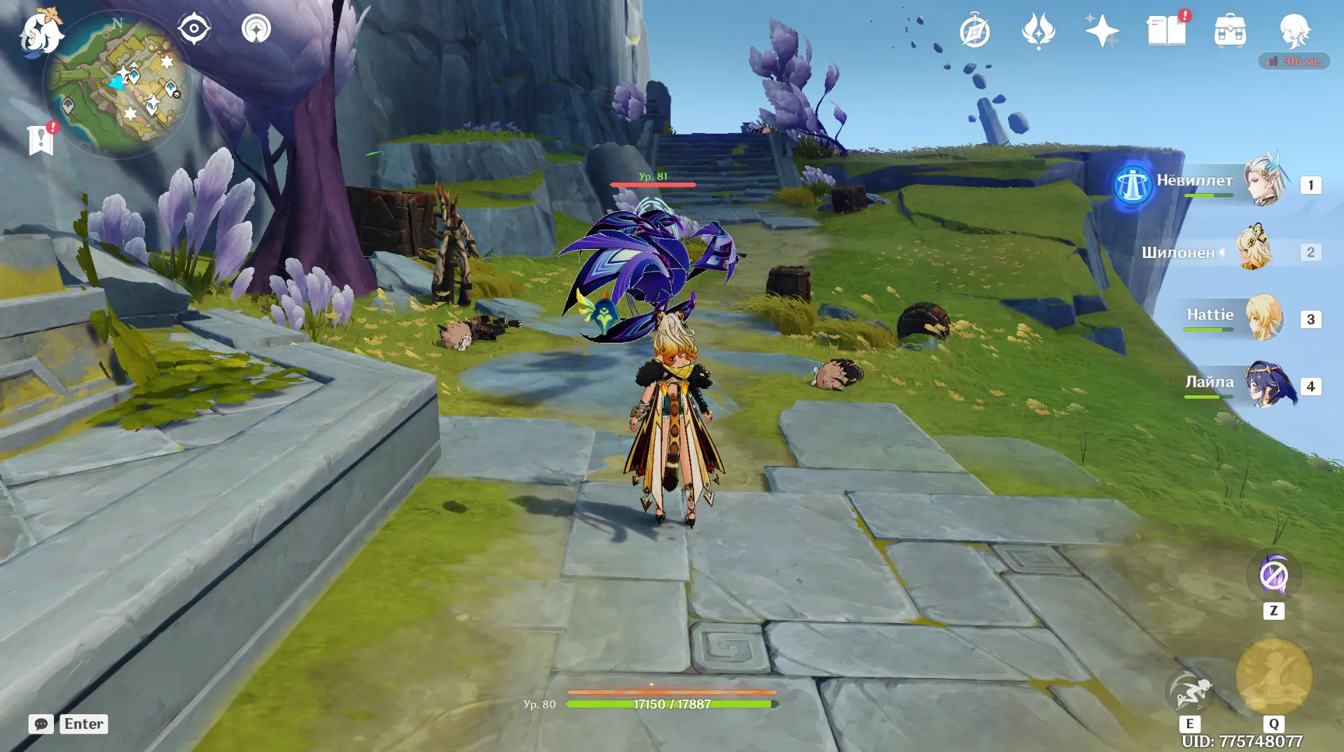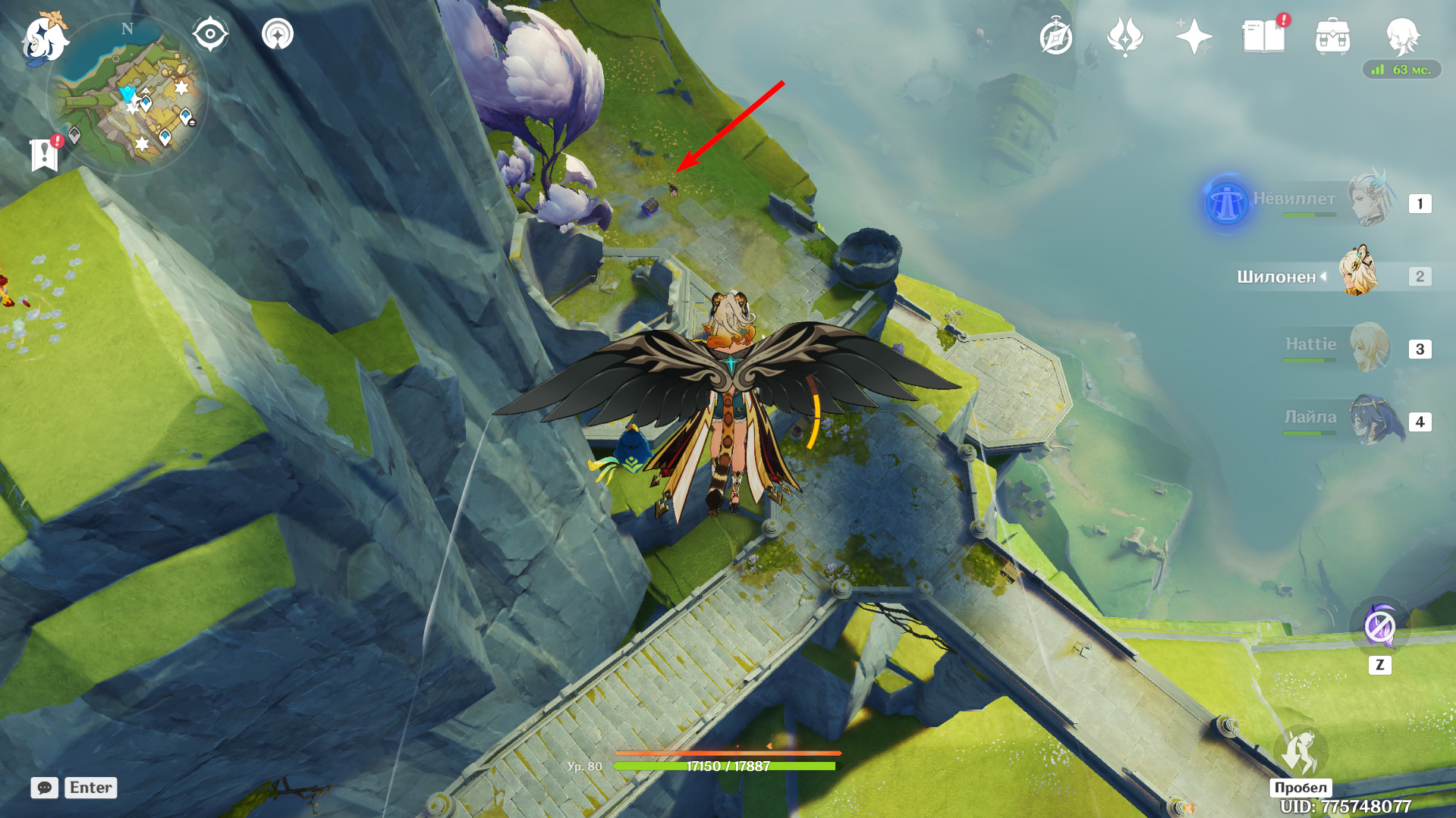 Вернитесь к предыдущему телепорту, но пройдите в этот раз немного западнее и прыгайте вниз. Возле группы погибших хиличурлов в руинах вы увидите богатый сундук, окутанный фиолетовым светом. Откройте его и одолейте первую мимифлору вместе с подоспевшим на помощь Кенином. Мужчина вновь попросит покинуть эти опасные места, а вы сможете забрать уже настоящую сокровищницу.