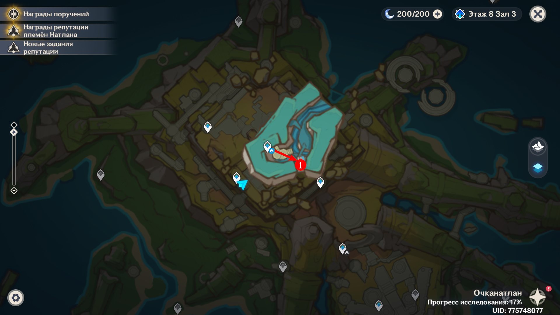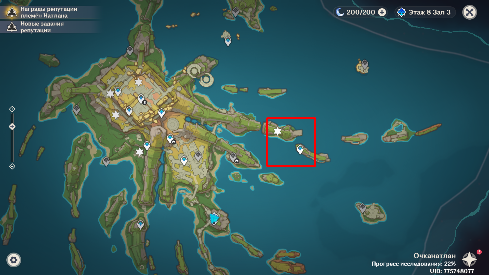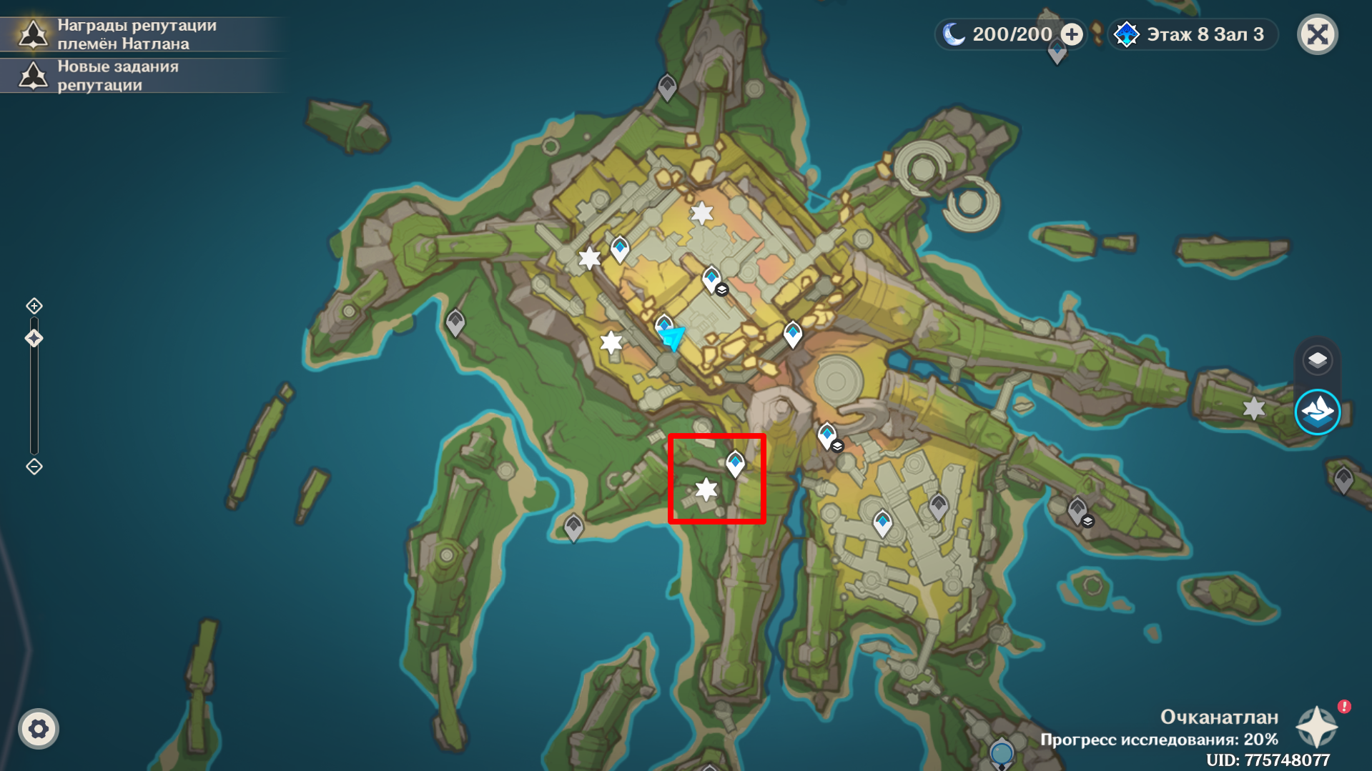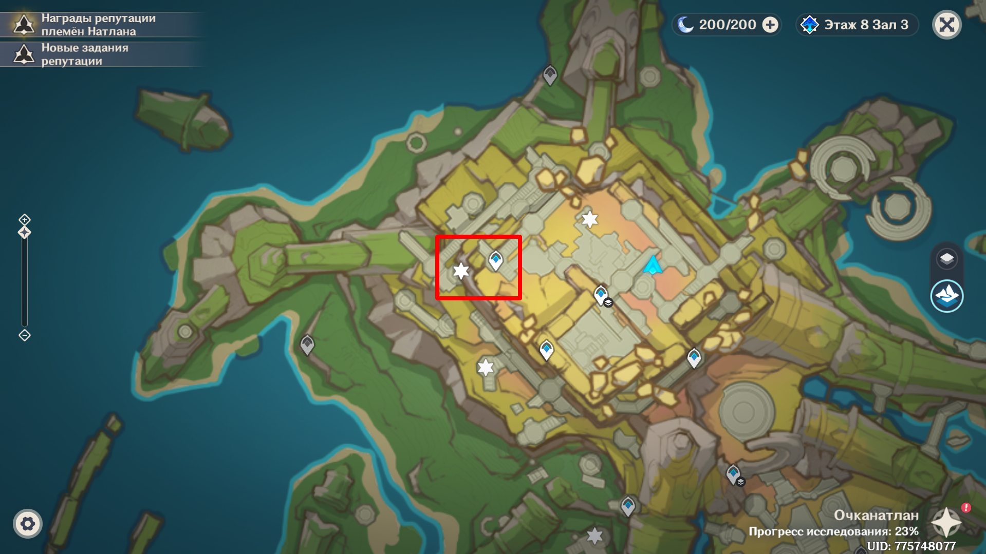 Телепортируйтесь на юго-запад Очканатлана, воспользовавшись соответствующей точкой перемещения. Прыгайте вниз и спланируйте к полуразрушенной башне на берегу. Откройте дверь фиолетовым переключателем и сразитесь с внезапно появившейся мимифлорой. После чего откройте богатый сундук (который тоже окажется врагом из Бездны). Вместе с Кенином расправьтесь с противником и заберите сокровищницу.