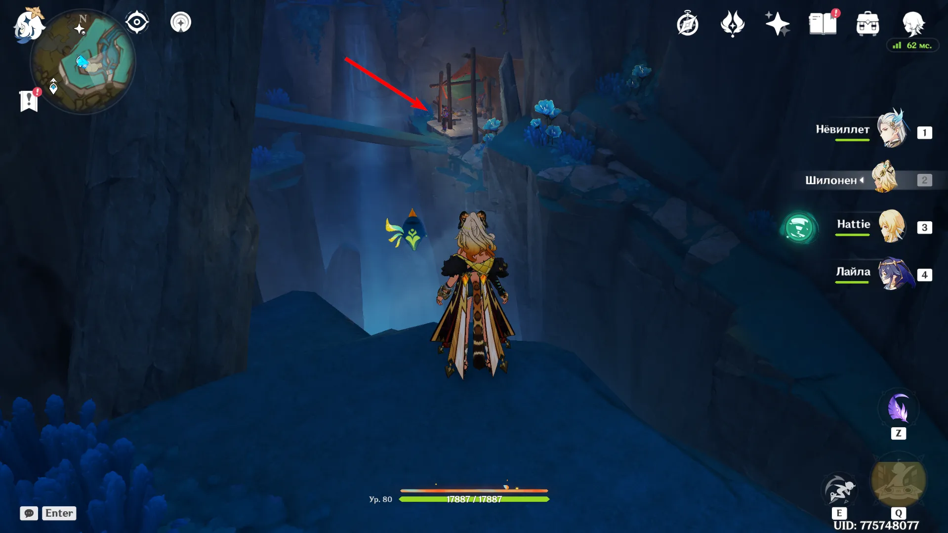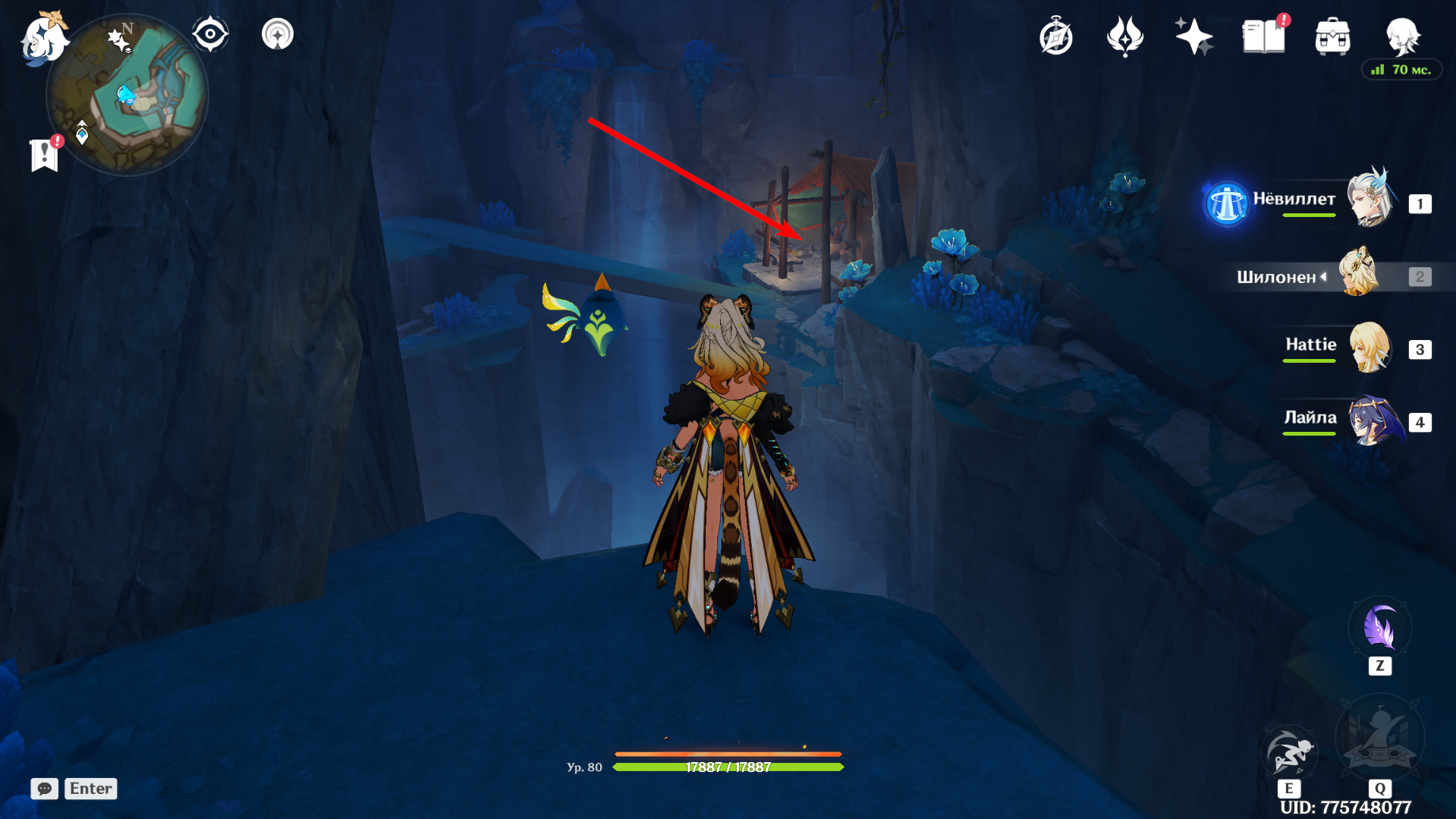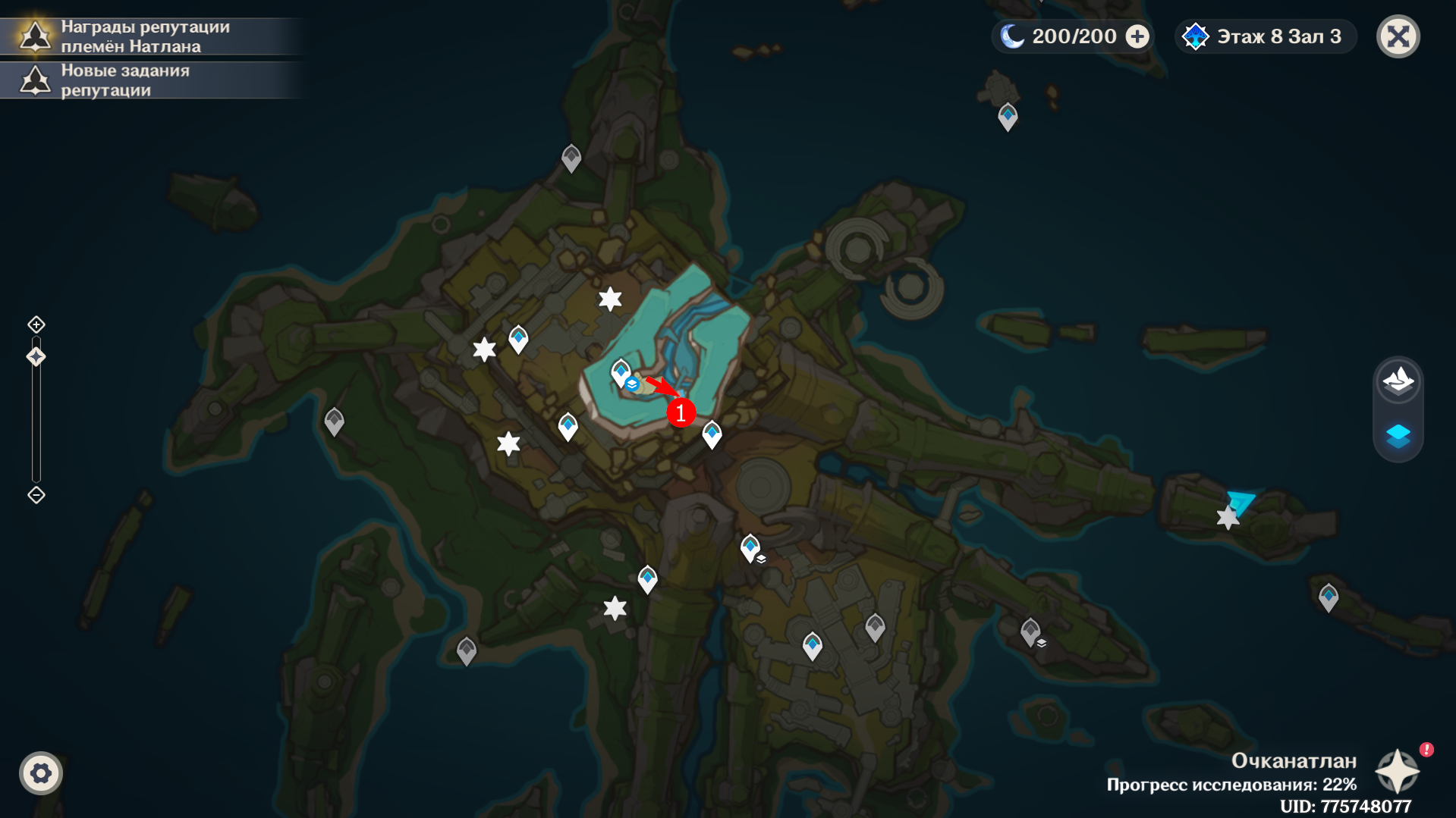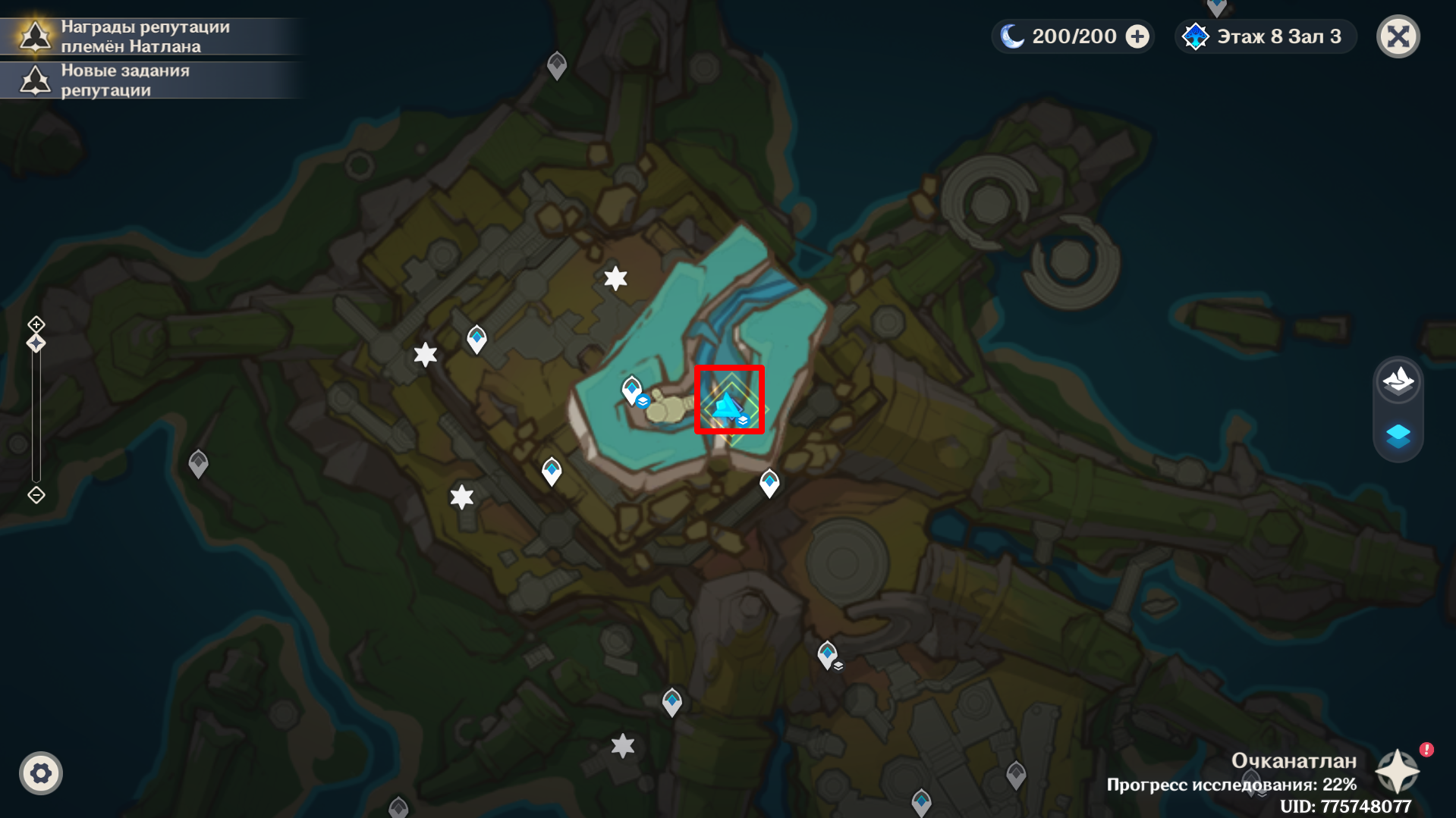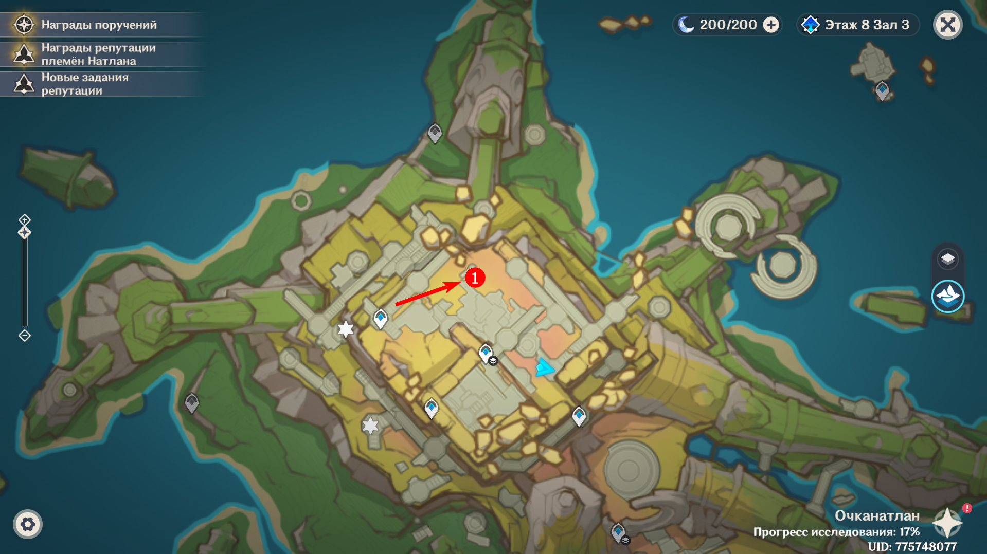 Телепортируйтесь на юго-запад Очканатлана, воспользовавшись соответствующей точкой перемещения. Прыгайте вниз и спланируйте к полуразрушенной башне на берегу. Откройте дверь фиолетовым переключателем и сразитесь с внезапно появившейся мимифлорой. После чего откройте богатый сундук (который тоже окажется врагом из Бездны). Вместе с Кенином расправьтесь с противником и заберите сокровищницу.