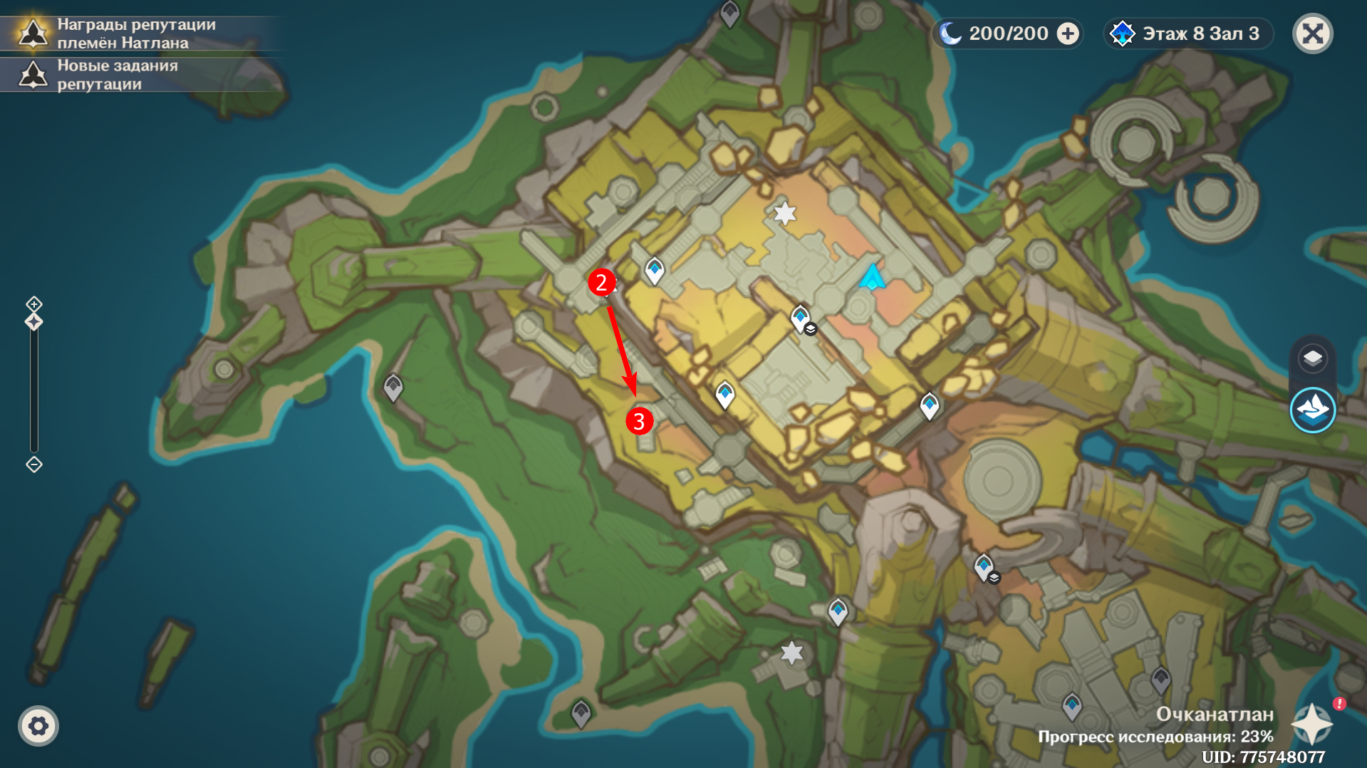 Отправляйтесь к островам в восточной части Очканатлана и воспользуйтесь телепортом на одной из скал, после чего перелетите перешеек на кукузавре или с помощью планера и окажетесь на склоне чуть севернее. Прыгайте вниз и обнаружите в ущелье двух стражей руин. Победите фиолетовый механизм, поговорите с Кенином и заберите богатый сундук.
