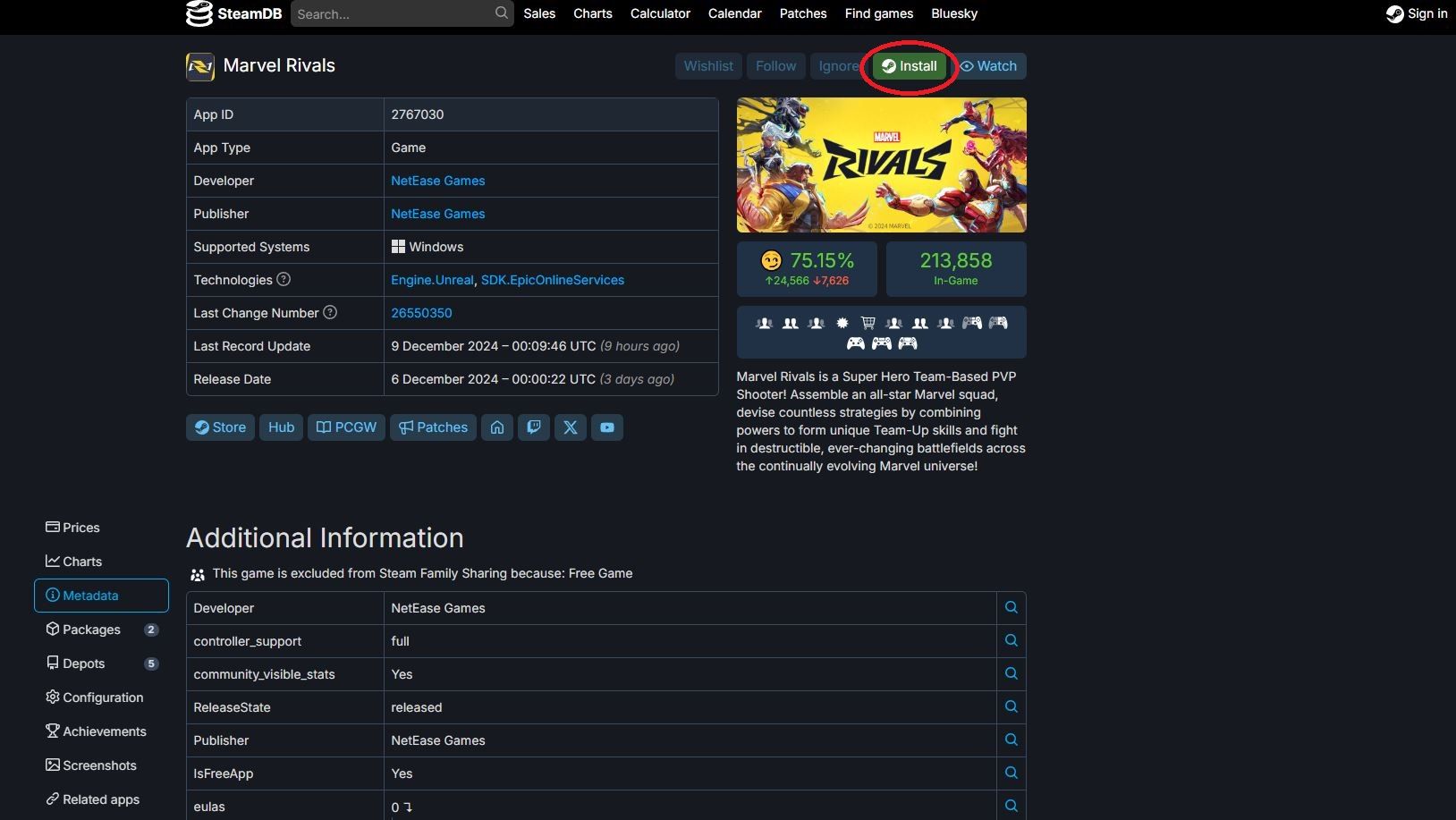 - Пройдите по ссылке на портал SteamDB: https://steamdb.info/app/2767030/. На этом сайте можно ознакомиться с полезной справочной информацией и статистикой по играм и приложениям, существующим в Steam. В верхней правой части страницы ищите зеленую кнопку Install. Нажмите ее, чтобы запустить процесс установки Marvel Rivals.