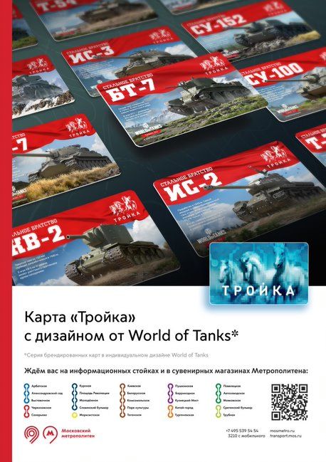 Московский метрополитен совместно с Wargaming выпустил проездные карты «Тройка» с изображением танков из World of Tanks к 75-летию Победы в Великой Отечественной войне. Всего в продаже доступны 10 тыс. экземпляров.