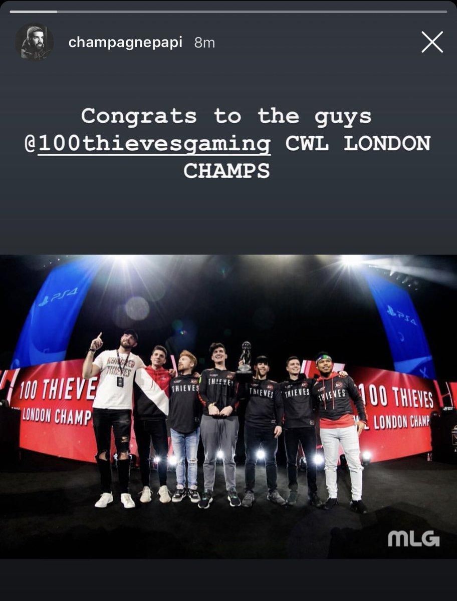 Рэпер Drake опубликовал пост в Instagram, в котором поздравил команду 100 Thieves по Call of Duty с победой на CWL London 2019. Это первый чемпионский титул 100T с момента ее основания в 2016 году.