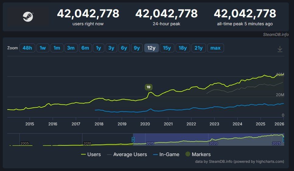 В Steam одновременно находилось более 42 млн человек. Это новый рекорд платформы. Информация об этом появилась на сайте SteamDB.