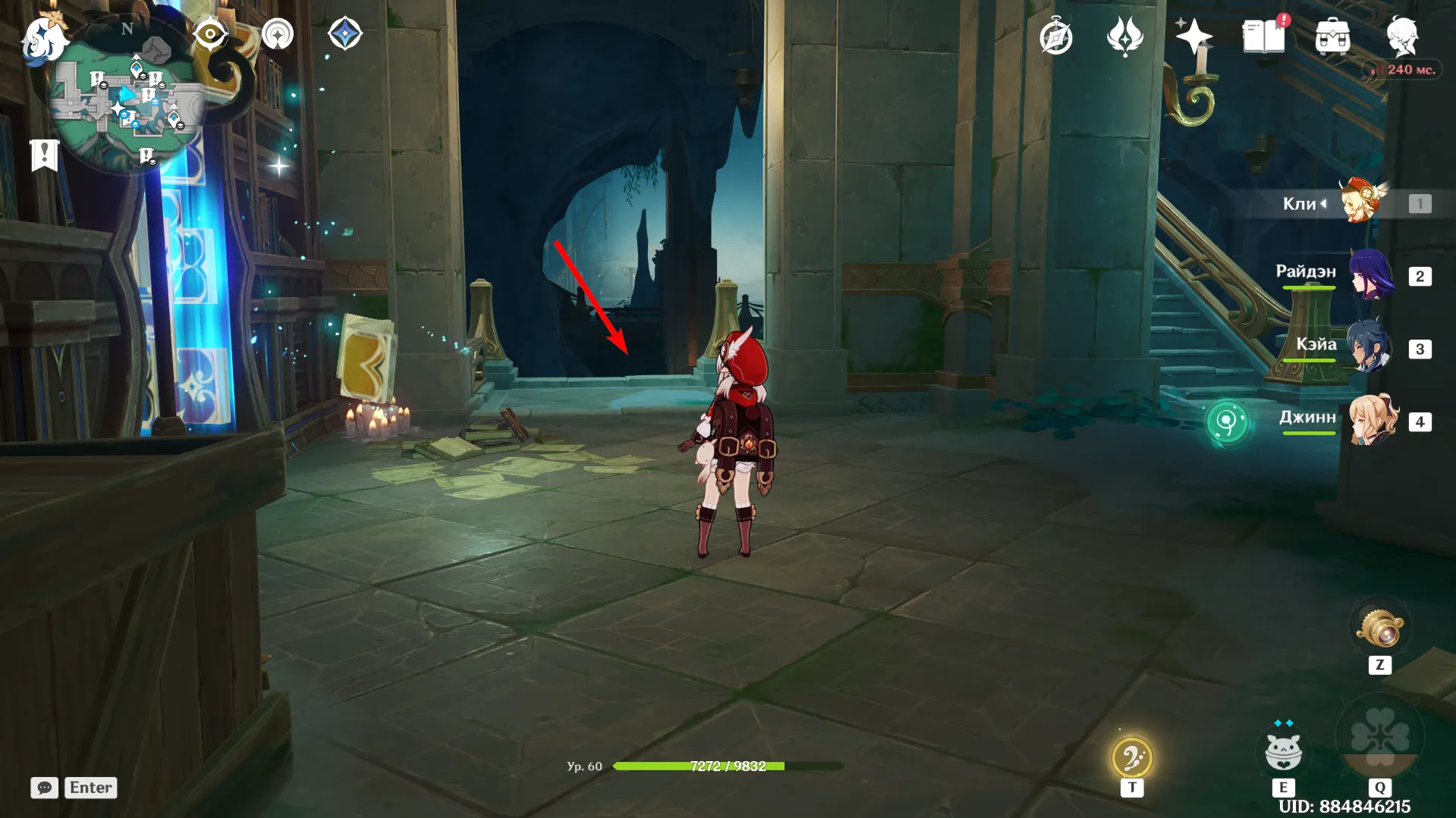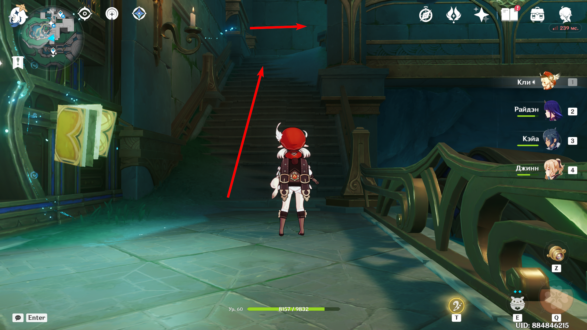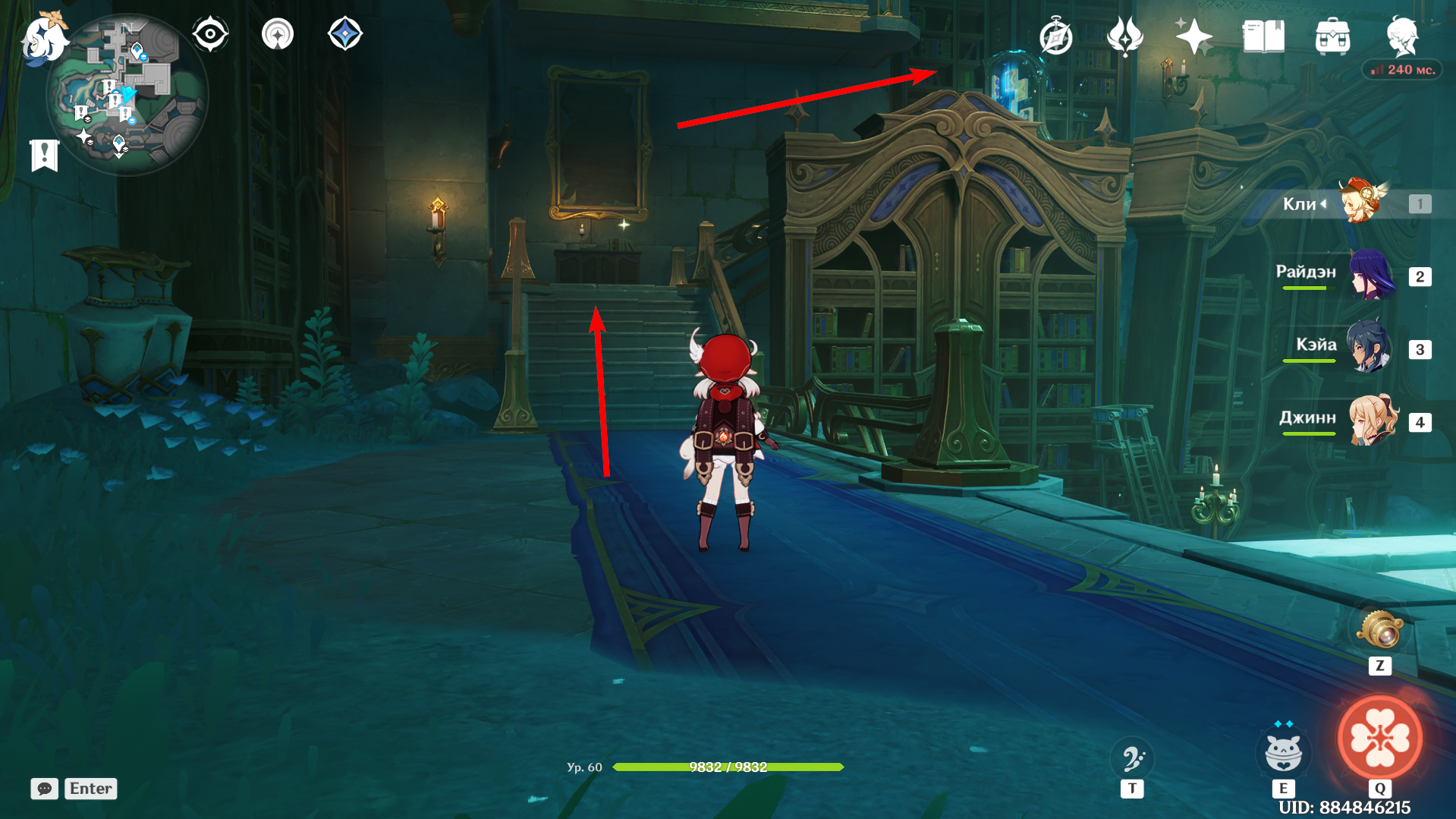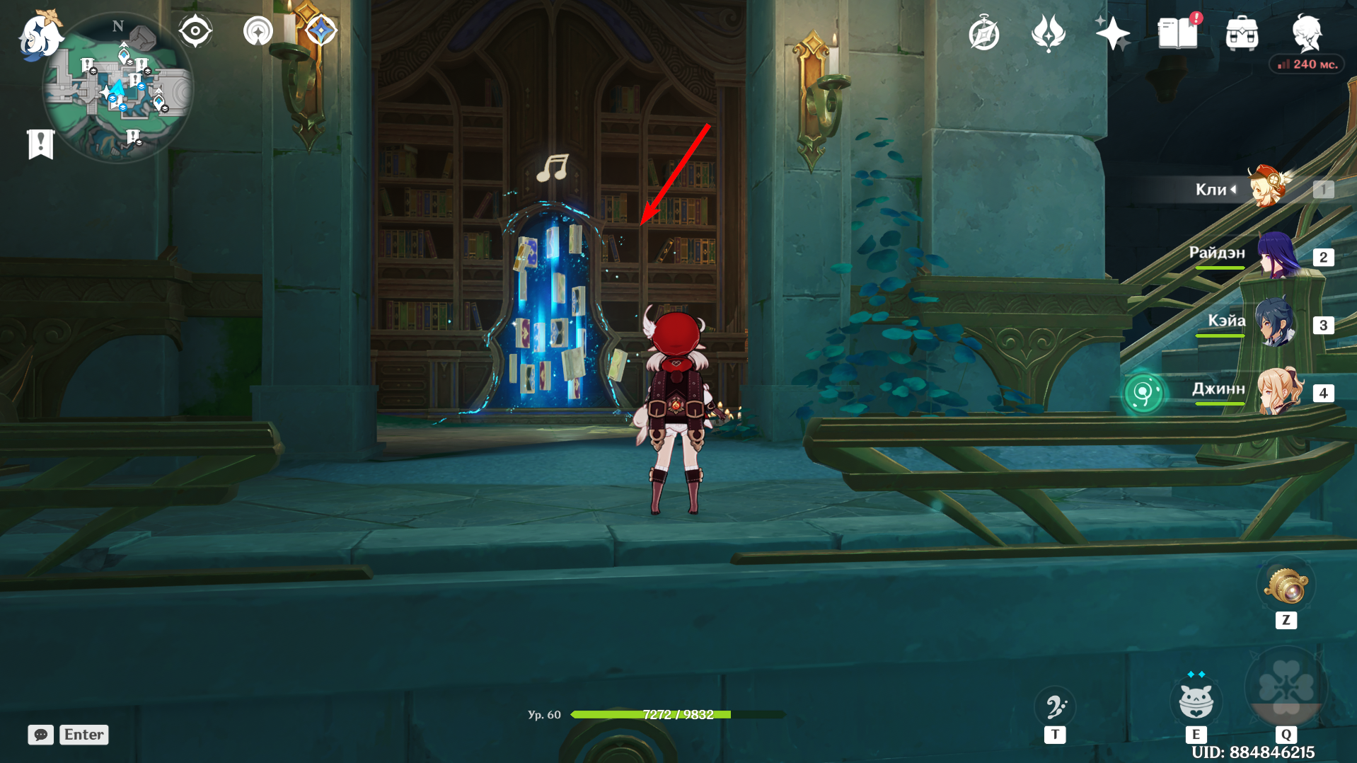 Телепортируйтесь ко входу в Обветшалый замок и бегите вперёд, минуя большое окно по левую руку и летающие в воздухе книги в центре коридора. Поверните налево, к двум колоннам возле большого книжного шкафа. Между колоннами и будет стоять первая книжная полка. Взаимодействуйте с ней и зайдите внутрь. Там будет стоять сундук, который охраняет голем. Победите врага и заберите награду.