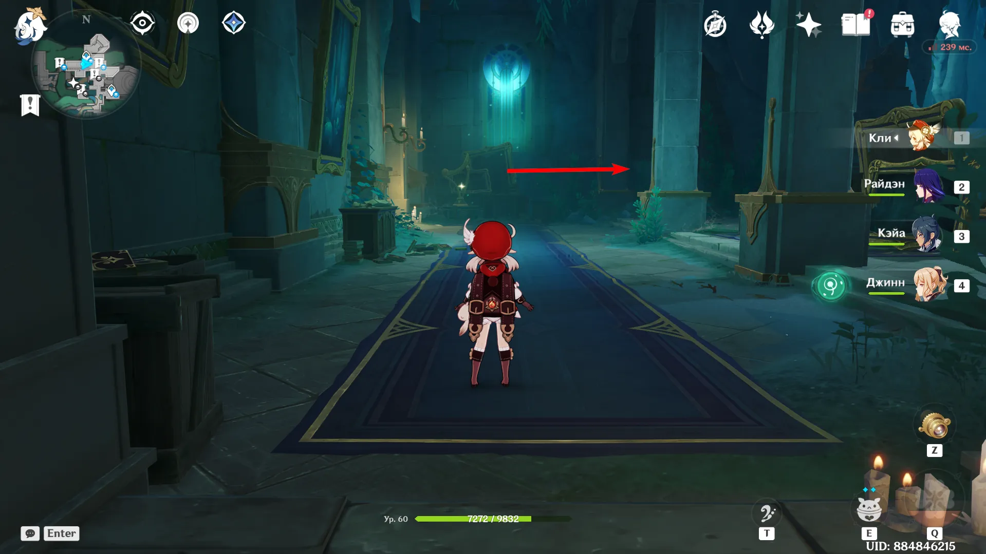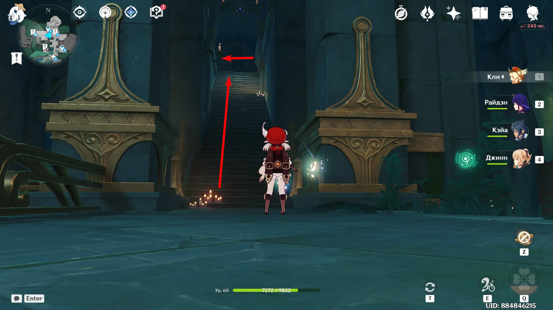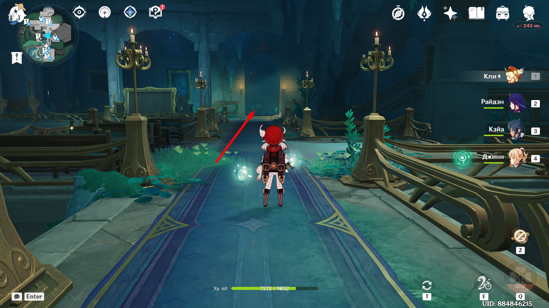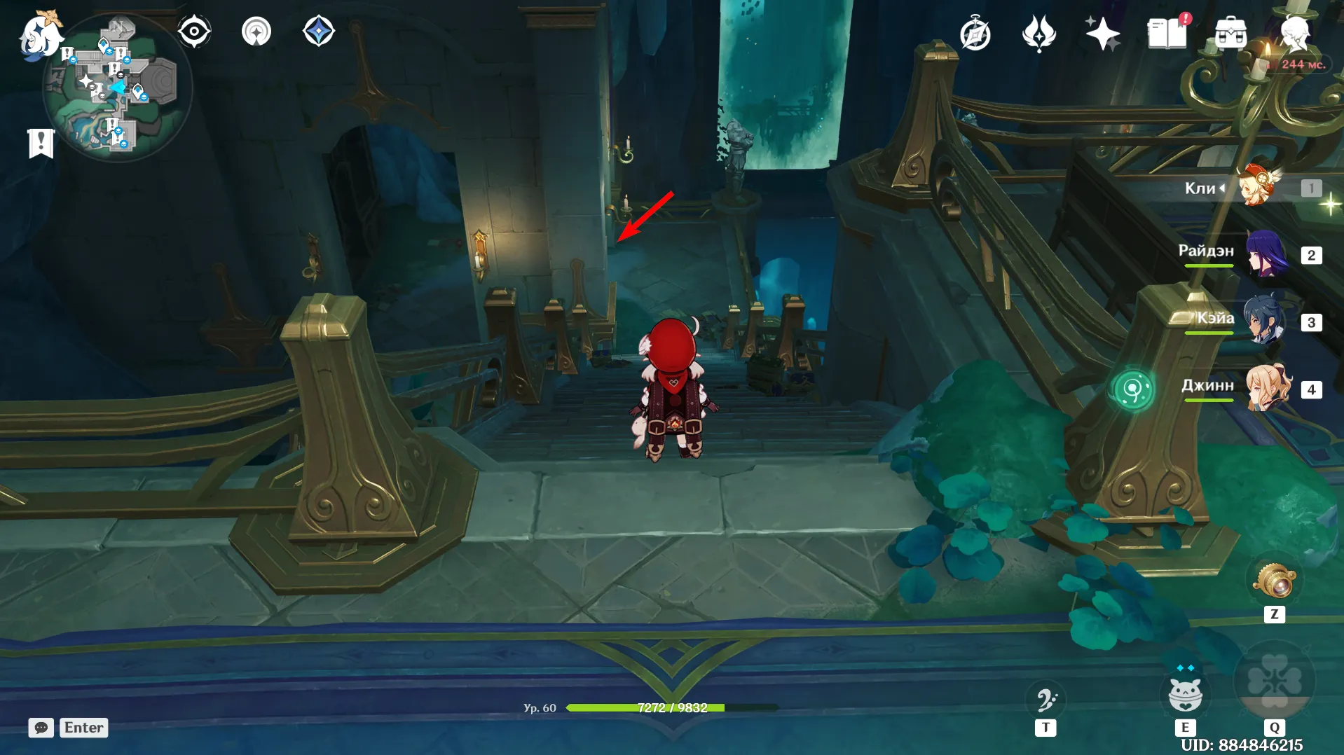 Телепортируйтесь ко входу в Обветшалый замок и бегите вперёд, минуя большое окно по левую руку и летающие в воздухе книги в центре коридора. Поверните налево, к двум колоннам возле большого книжного шкафа. Между колоннами и будет стоять первая книжная полка. Взаимодействуйте с ней и зайдите внутрь. Там будет стоять сундук, который охраняет голем. Победите врага и заберите награду.