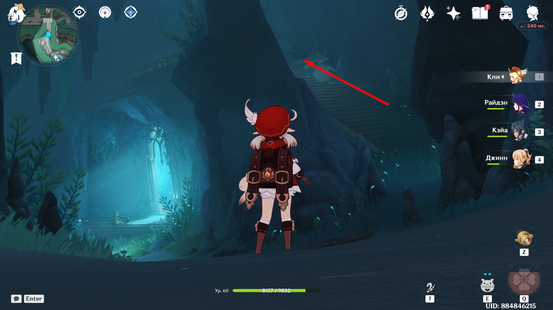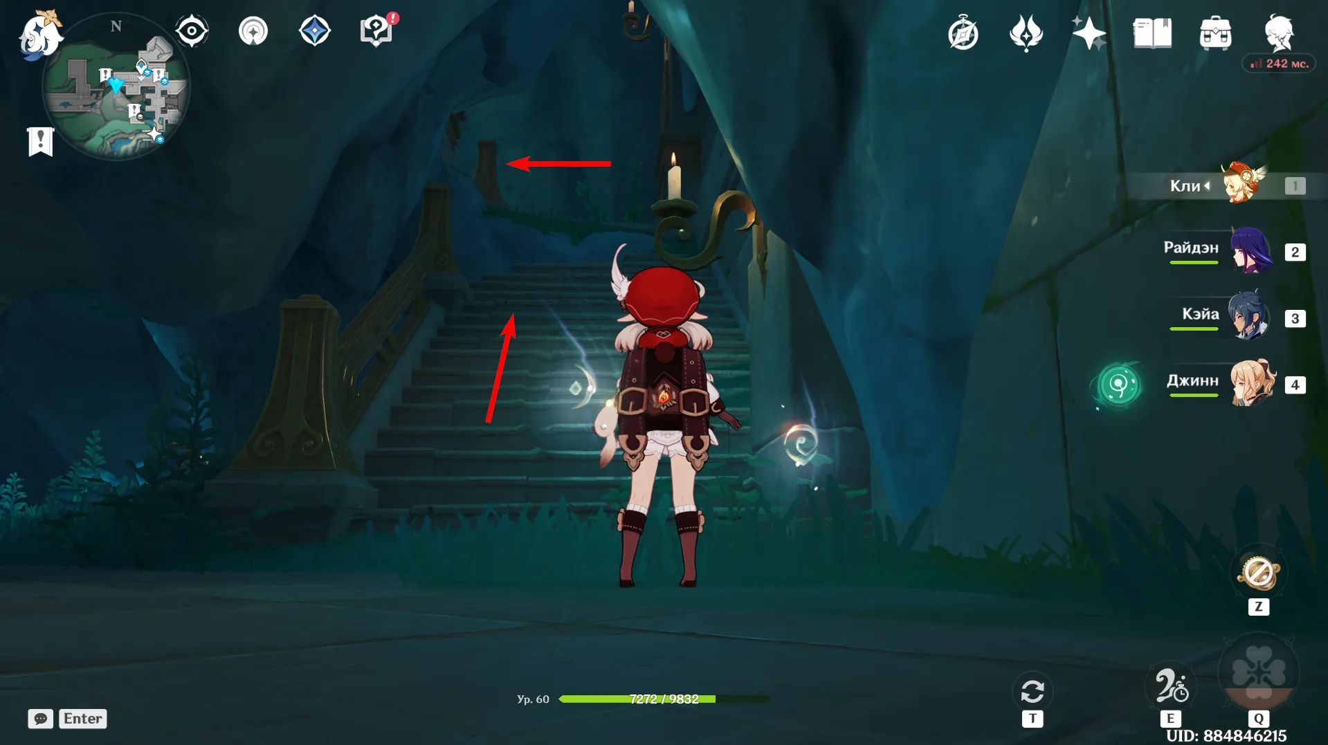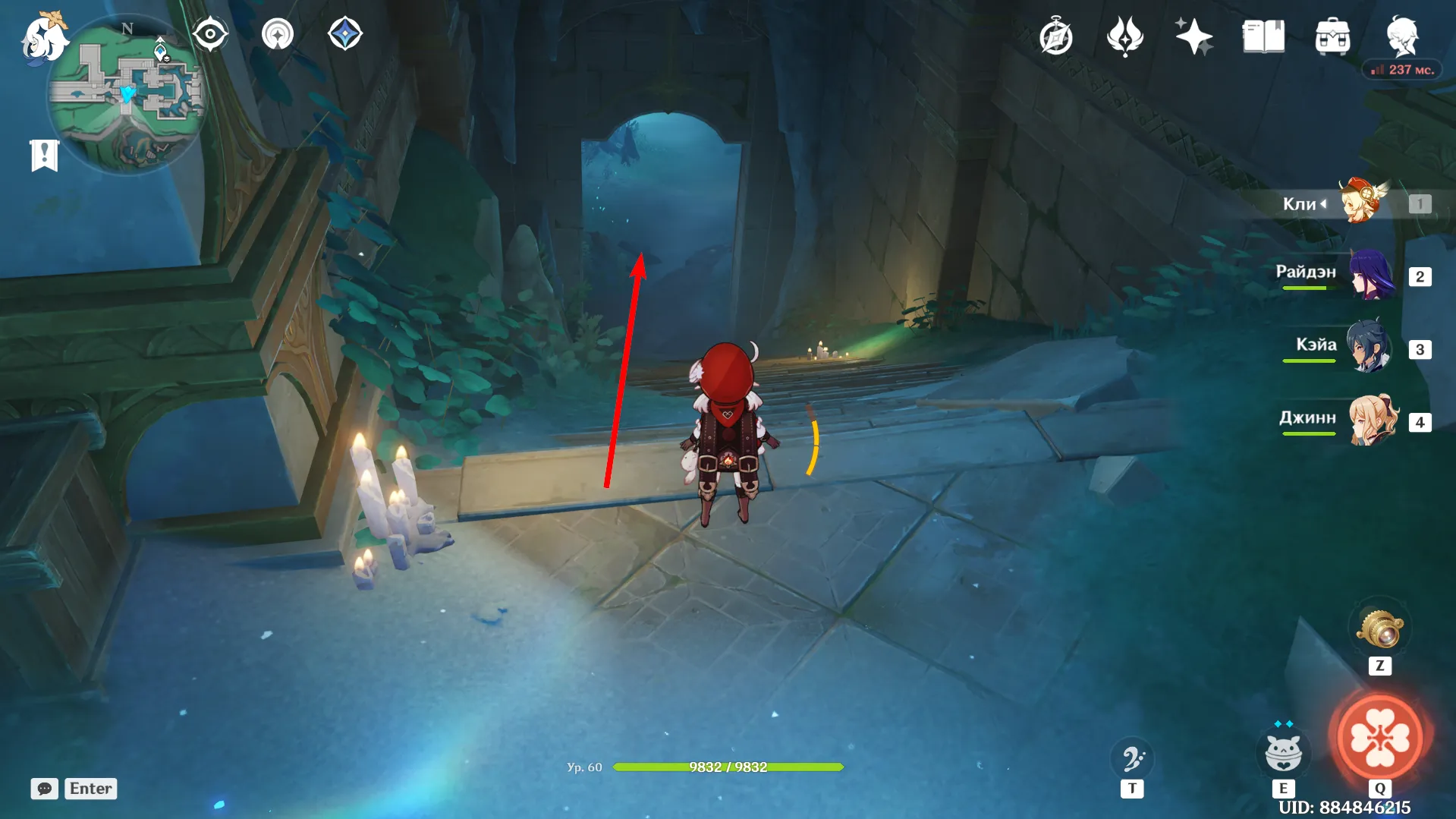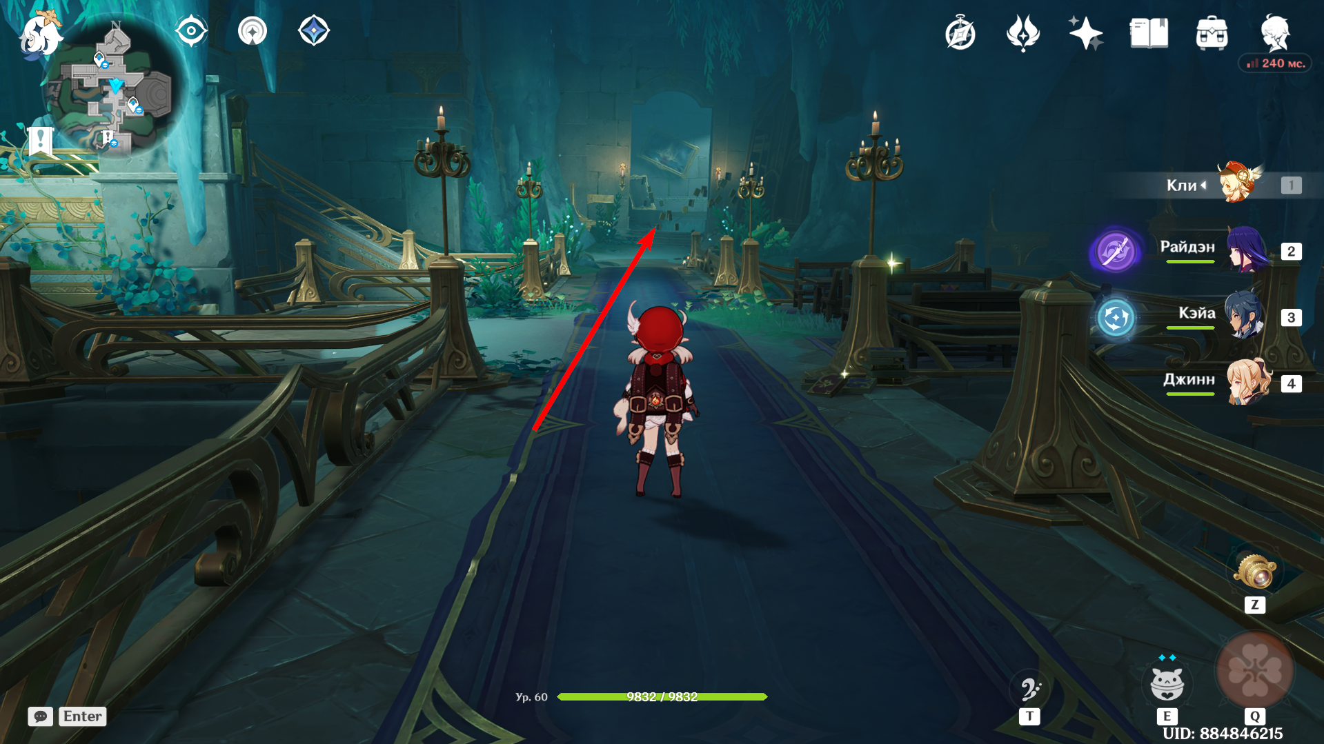 Телепортируйтесь ко входу в Обветшалый замок и бегите вперёд, минуя большое окно по левую руку и летающие в воздухе книги в центре коридора. Поверните налево, к двум колоннам возле большого книжного шкафа. Между колоннами и будет стоять первая книжная полка. Взаимодействуйте с ней и зайдите внутрь. Там будет стоять сундук, который охраняет голем. Победите врага и заберите награду.