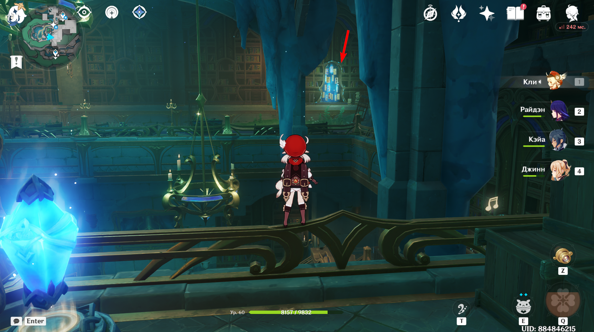 От предыдущего места поднимитесь по лестнице вверх. Напротив картины и синего кристалла видно ещё одно хранилище. Гримуар можно найти рядом с ним. Просто взаимодействуйте с книгой и верните её на полку. Внутри можно найти богатый сундук.