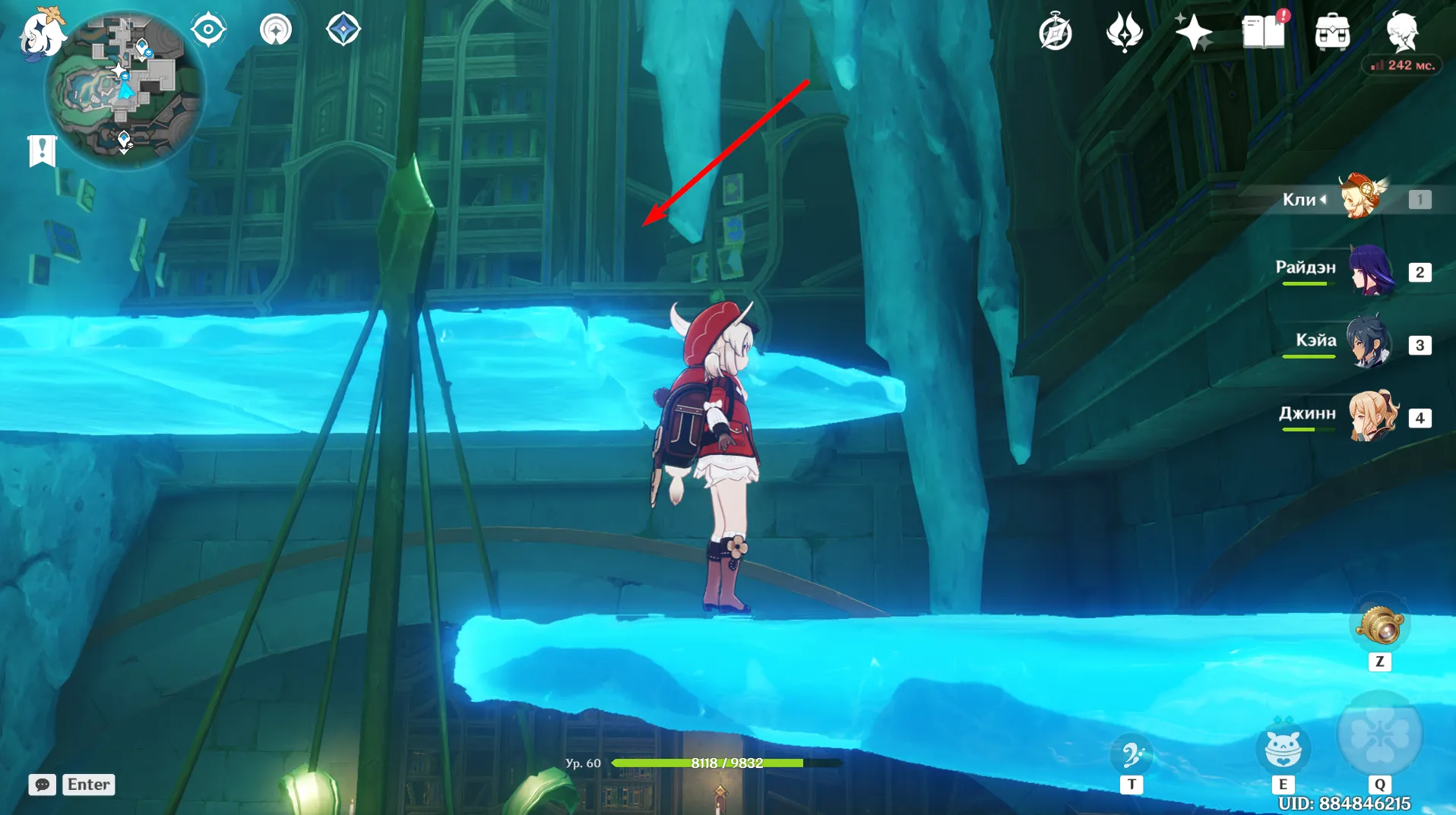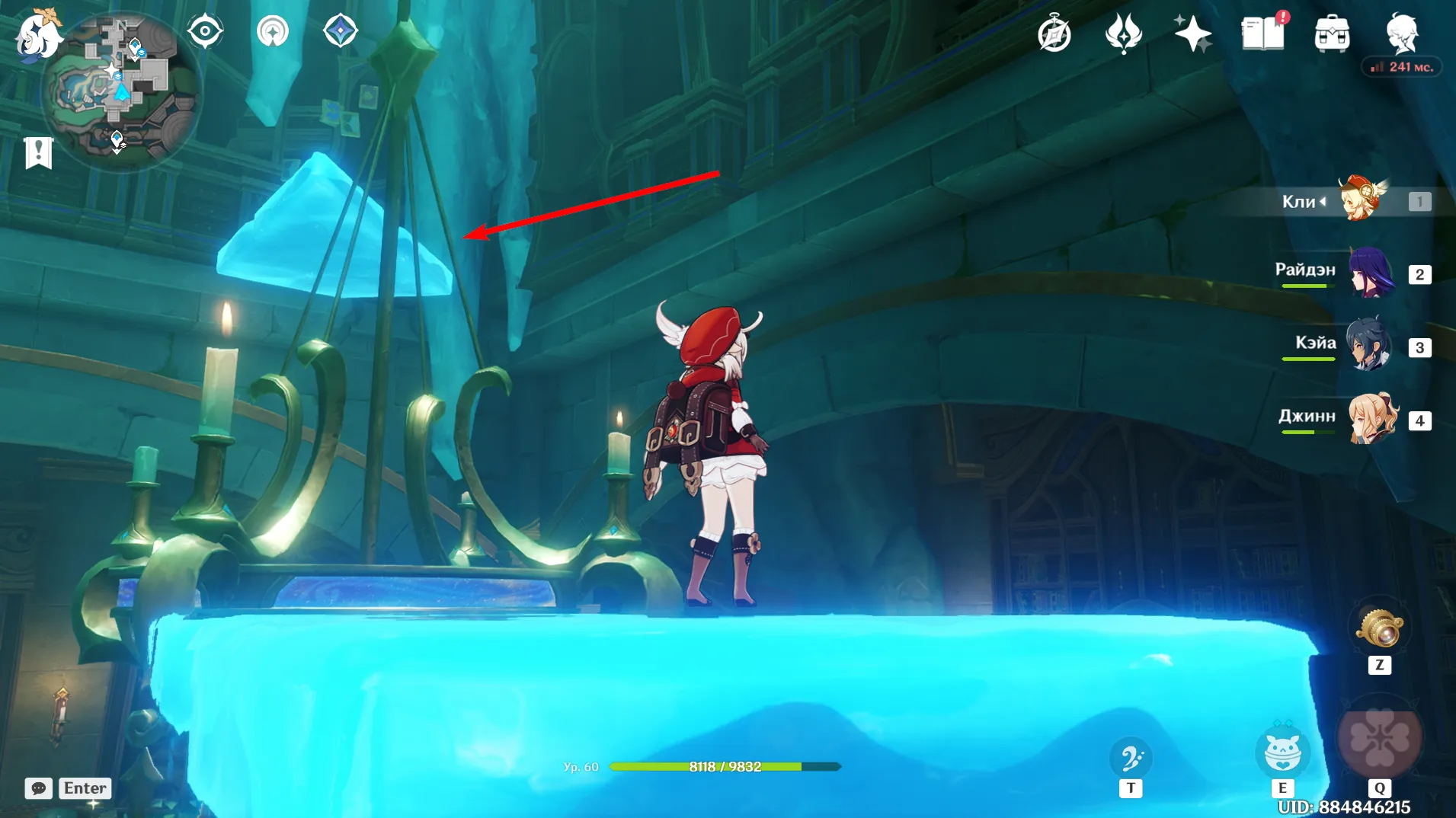 Вернитесь к синему кристаллу рядом с картиной. Ударьте его обычной атакой, чтобы он сменил цвет на оранжевый. Слева от камня начнут двигаться голубые пластины. Залезьте на одну из них и просто подождите, когда она начнёт подниматься. Где-то на середине пути переберитесь на другую пластину, а затем — ещё на одну.