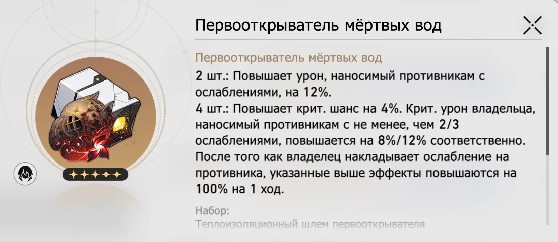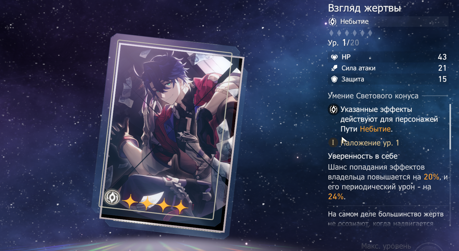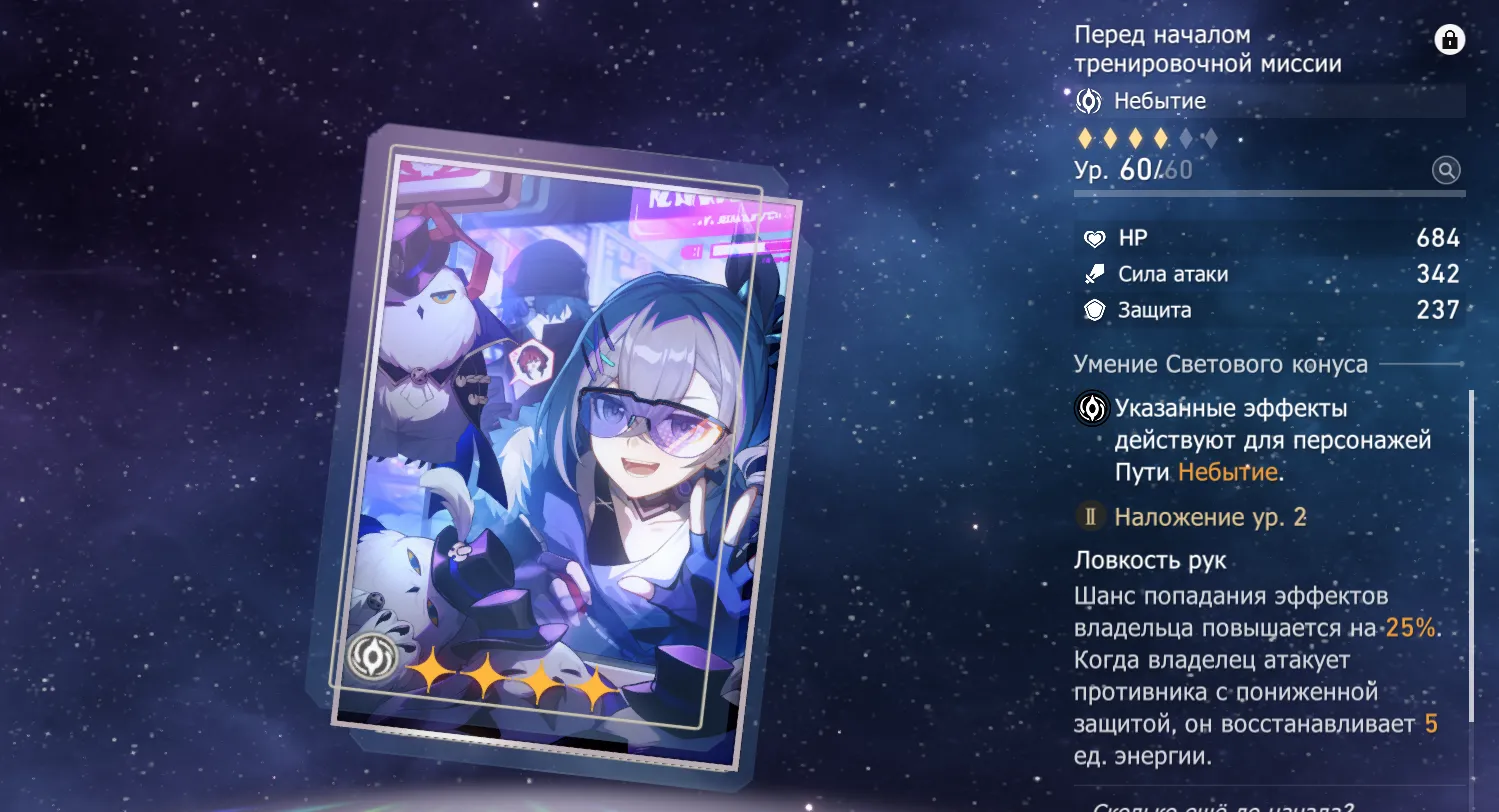 «Перед началом тренировочной миссии» — конус эпической редкости, который может стать отличной альтернативой и «Взгляду жертвы», и сигнатурке Цзяоцю. Оружие даёт прирост к шансу попадания эффектов, а также позволяет быстрее накапливать ульту — основной источник DPS героя. Эту «карточку» также стоит прокачать до пятого уровня наложения, чтобы максимально реализовать её потенциал.