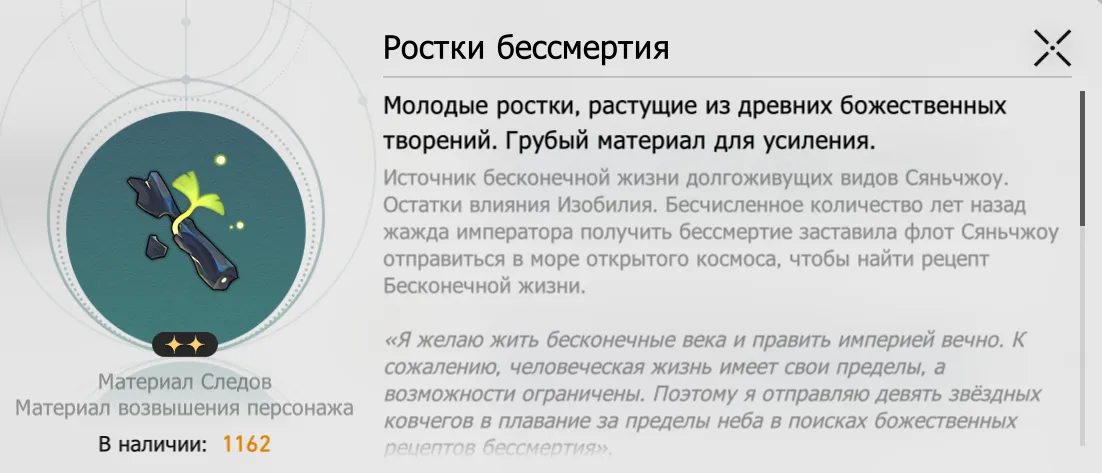Ростки бессмертия, эфирный цветок бессмертия, ветвь бессмертной славы — ресурсы, которые выпадают из Мерзостей Изобилия, а также их можно добыть за прохождение чашелистов или в Виртуальной вселенной. Для прокачки нужно собрать по 15 единиц каждого типа.
