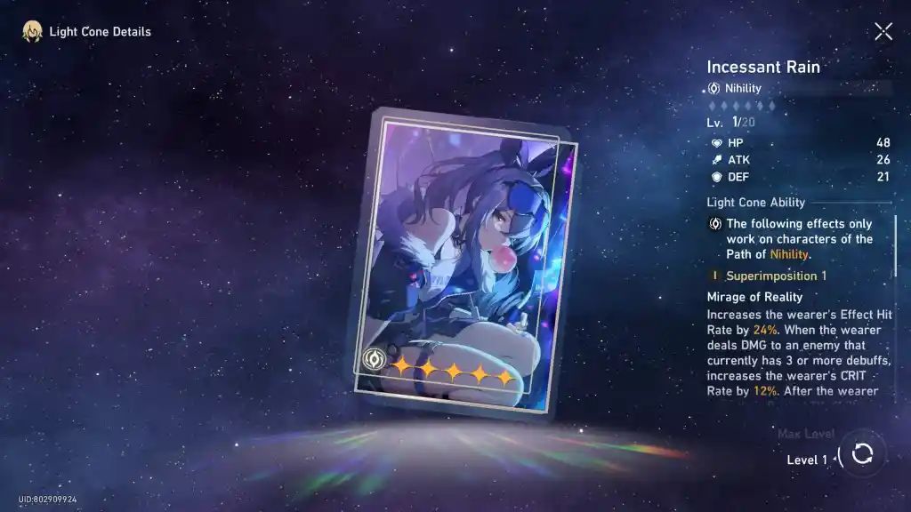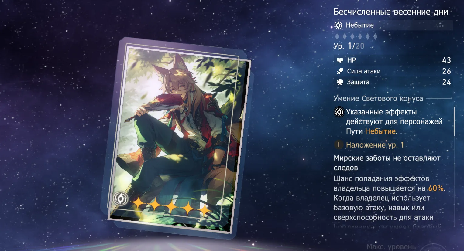 «Бесчисленные весенние дни» — сигнатурный световой конус Цзяоцю, который, очевидно, будет на голову выше других в списке. Он закрывает все потребности персонажа, повышая сразу несколько характеристик: шанс попадания эффектов, входящий урон по противникам и силу атаки. Благодаря своему таланту Цзяоцю сможет с лёгкостью реализовать пассивку конуса и дополнительно повысить дамаг по врагу.