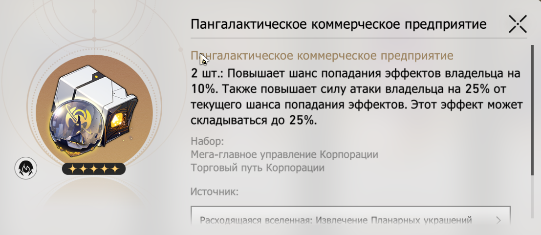 «Пангалактическое коммерческое предприятие» — лучший набор планарных украшений для Цзяоцю, который подходит лису идеально и не имеет даже приблизительно полезных аналогов. Комплект даёт прибавку к шансу попадания эффектов, а также прирост к силе атаки — двум главным характеристикам для героя.