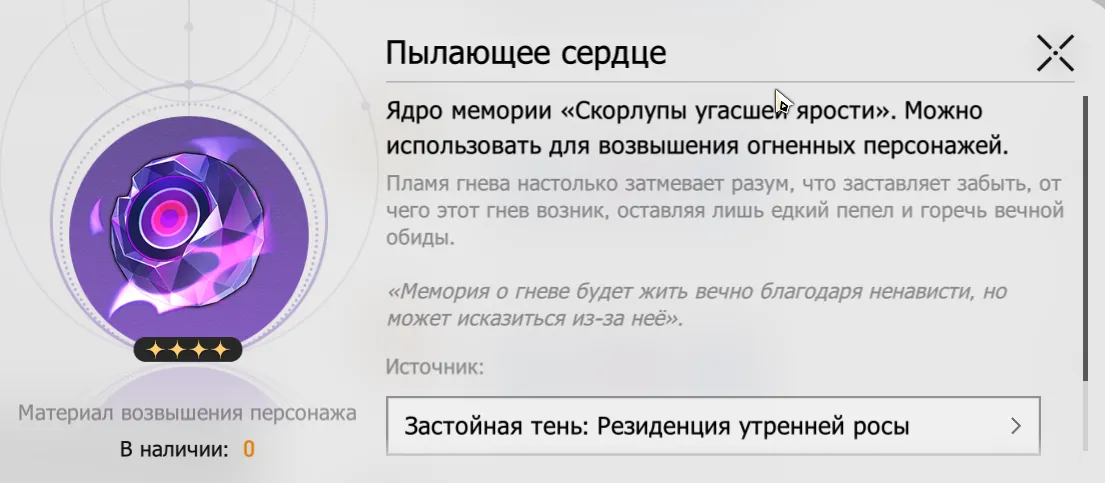 Пылающее сердце — материал, который даётся за прохождение «Застойной тени: Форма гнева». Подземелье находится в Резиденции утренней росы на Пенаконии.