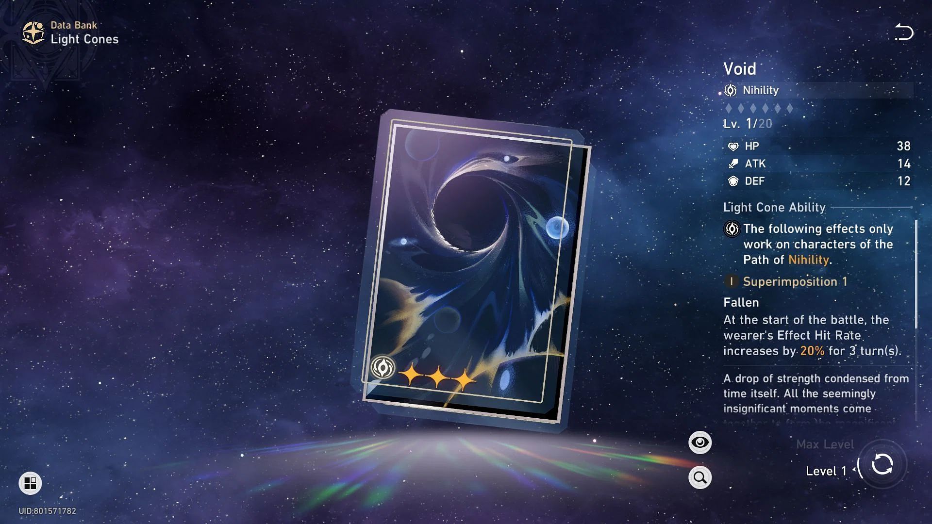 «Пустота» — отличный световой конус для новичков, не имеющих иных вариантов экипировки. Несмотря на низкую редкость, оружие обеспечивает Цзяоцю прибавку к шансу попадания эффектов. «Карточка» подходит для быстрых боёв с минимальным количеством врагов. Однако в дальнейшем стоит заменить конус на более релевантный.