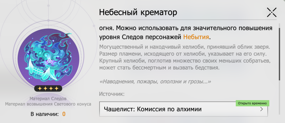 Огненный дух, эссенция звёздного огня, небесный крематор — эти материалы можно получить после прохождения багрового чашелиста «Бутон Небытия» в Комиссии по алхимии на Лофу Сяньчжоу. Для прокачки Цзяоцю необходимо нафармить 18 духов, 69 ед. эссенции и 139 крематоров.